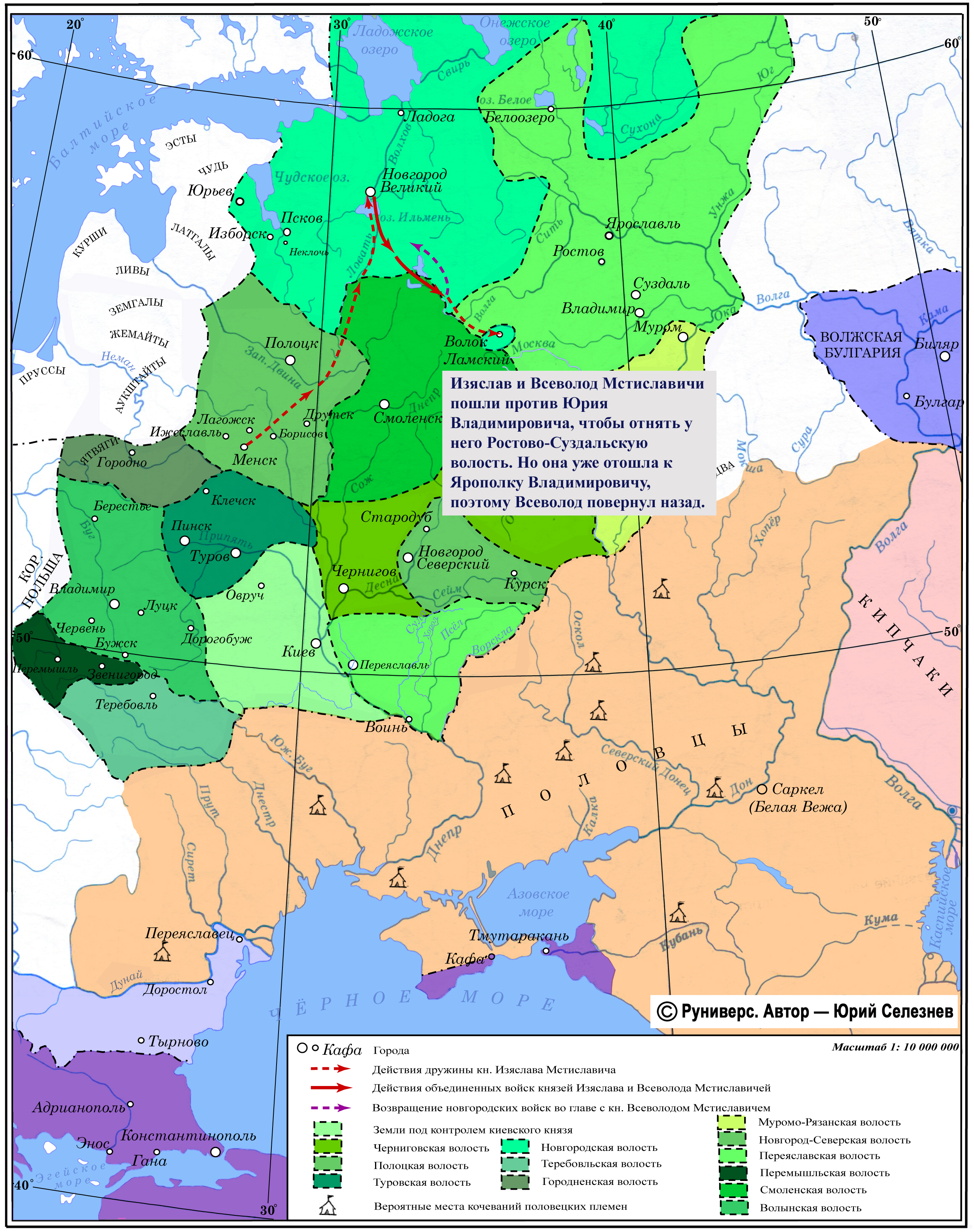 Изяслав и Всеволод Мстиславичи пошли против Юрия Владимировича, чтобы отнять у него Ростово-Суздальскую волость. Но она уже отошла к Ярополку Владимировичу, поэтому Всеволод повернул назад.