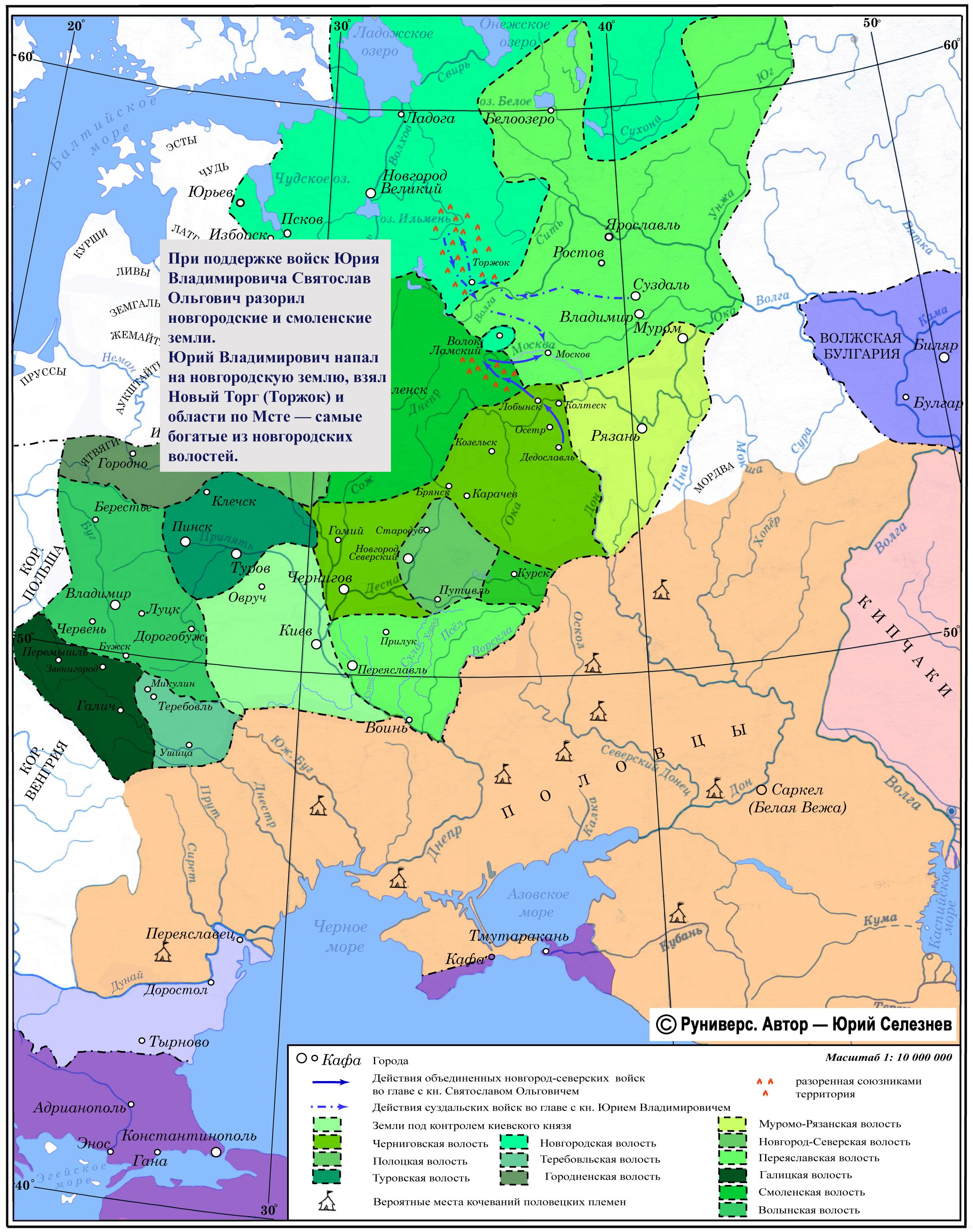 При поддержке войск Юрия Владимировича Святослав Ольгович разорил новгородские и смоленские земли. Юрий Владимирович напал на новгородскую землю, взял Новый Торг (Торжок) и области по Мсте — самые богатые из новгородских волостей.
