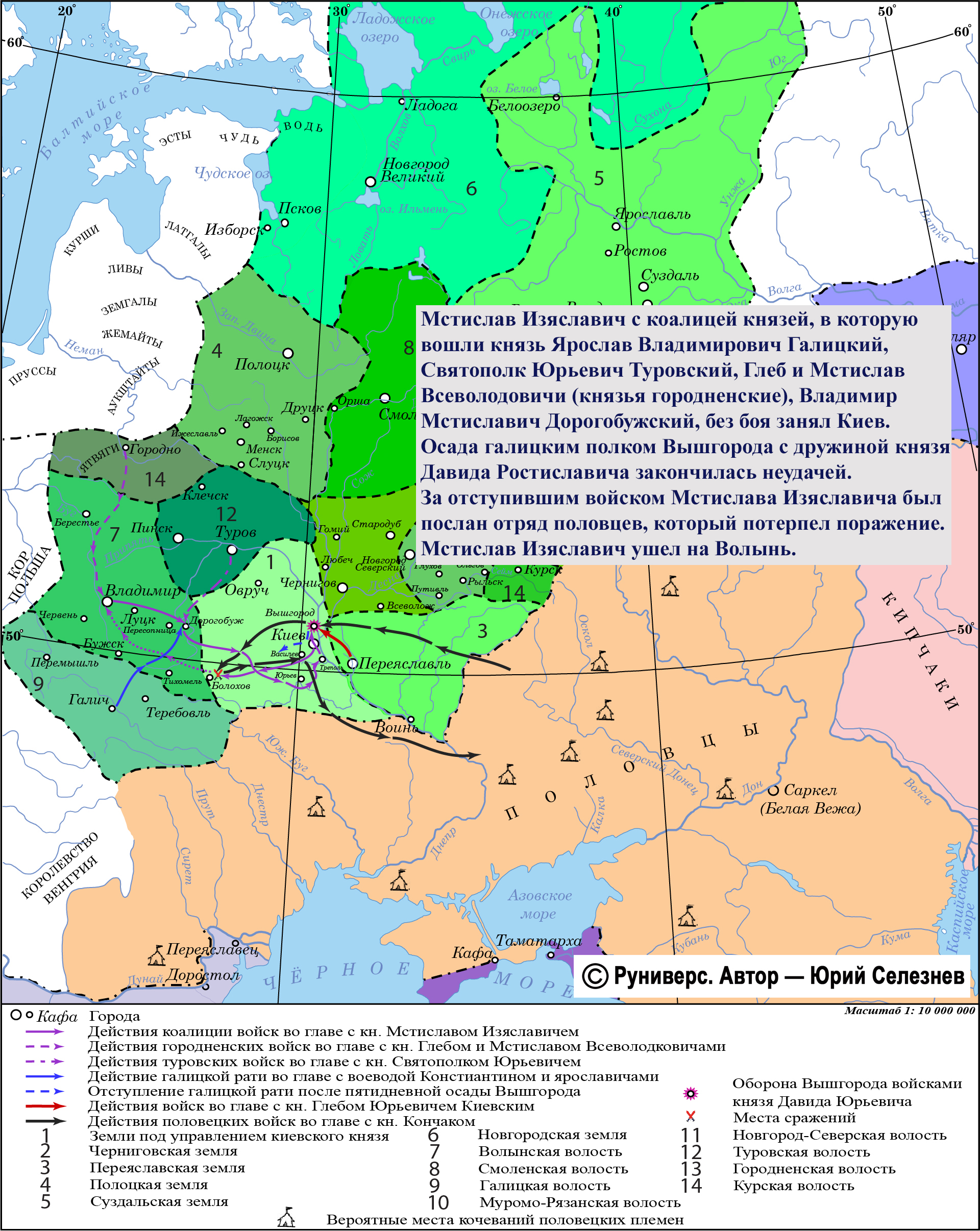 Мстислав Изяславич попытался вновь закрепиться в Киеве. Собрав коалицию князей, в которую вошли князь Ярослав Владимирович Галицкий, Святополк Юрьевич Туровский), Глеб и Мстислав Всеволодовичи (князья Городненьские), Владимир Мстиславич Дорогобужский, а также отряды берендеев и торков, он выдвинулся к Киеву и без боя занял столицу Руси.