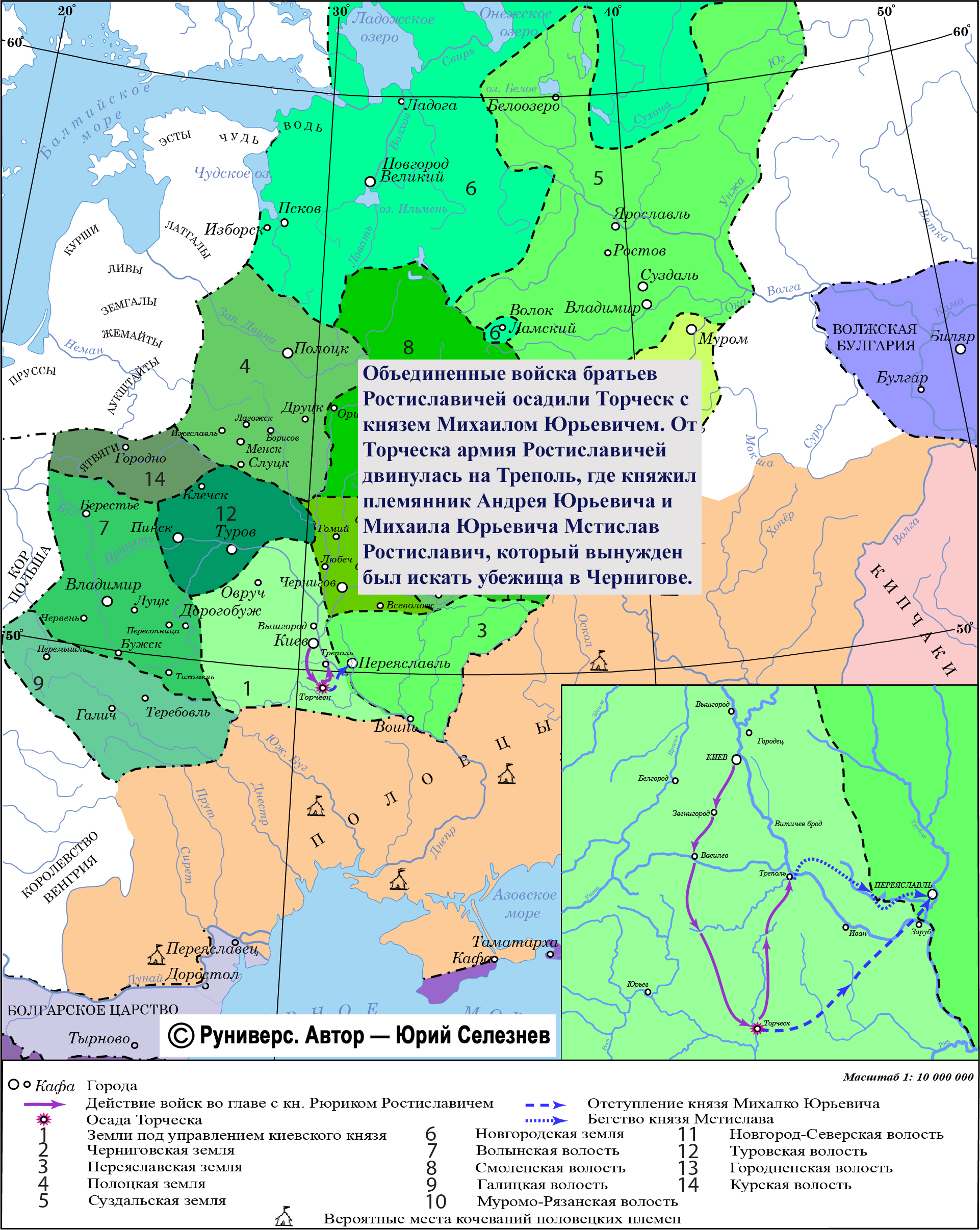 После того как великим князем был провозглашен Рюрик Ростиславич, объединенные войска братьев Ростиславичей двинулись на Торческ, где осадили другого номинального главу Руси — князя Михаила Юрьевича. После семидневной осады противники заключили мирный договор, по которому Михаил Юрьевич получал в княжение Переяславль. От Торческа армия Ростиславичей двинулась на Треполь, где княжил племянник Андрея Юрьевича и Михаила Юрьевича Мстислав Ростиславич, который вынужден был искать убежища в Чернигове.