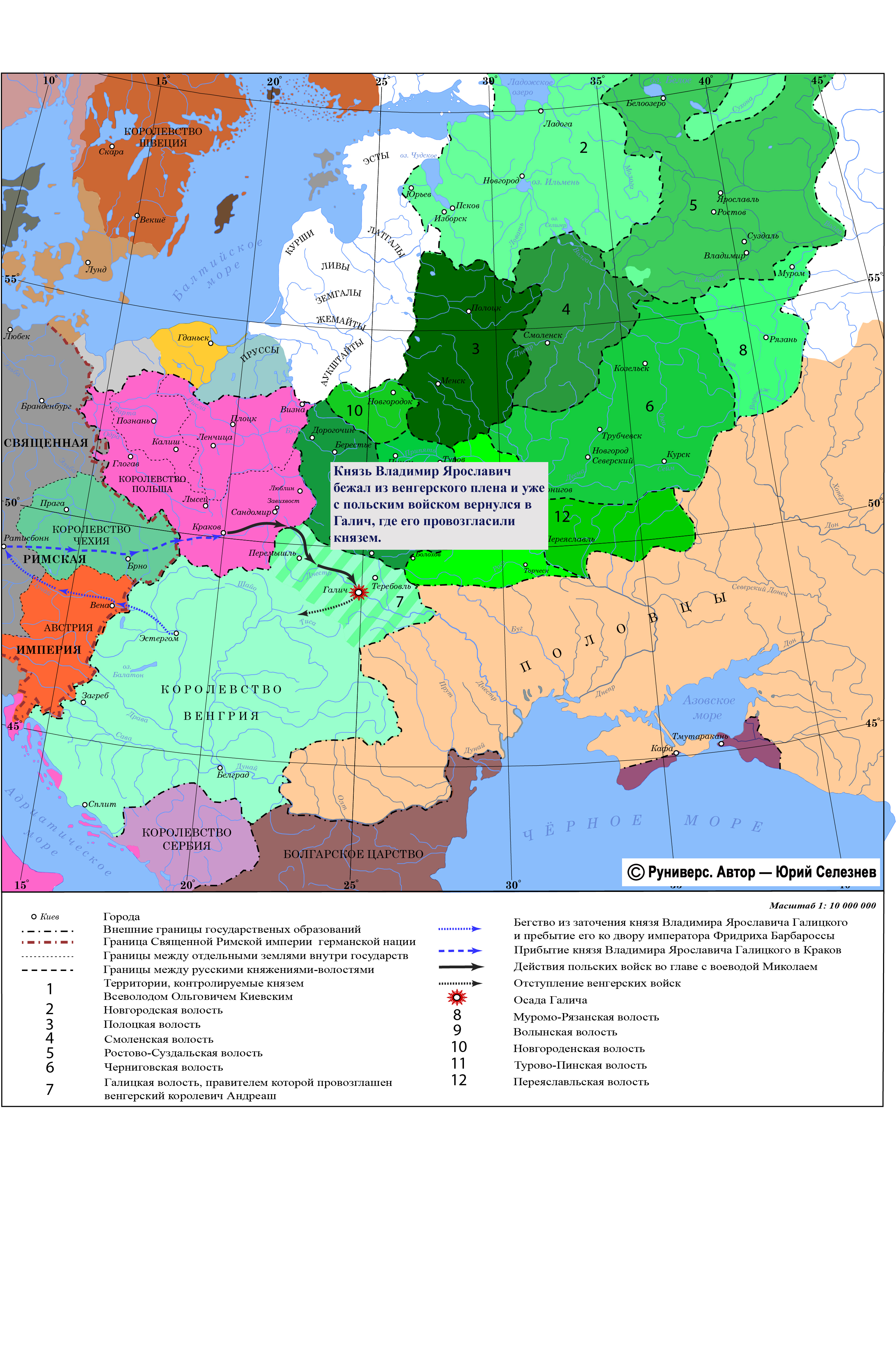 Князь Владимир Ярославич бежал из венгерского заточения и прибыл ко двору императора Фридриха Барбароссы, который собирался в крестовый поход. Император направил его в Польшу к князю Казимиру с поручением, чтобы тот помог получить Владимиру галицкий стол. Когда галичане узнали о приближении Владимира Ярославича с польским войском, то провозгласили его своим князем, а королевича с венграми изгнали. Гарантом его правления стал, кроме императора Фридриха Барбароссы, суздальский князь — дядя Всеволод Юрьевич Суздальский.