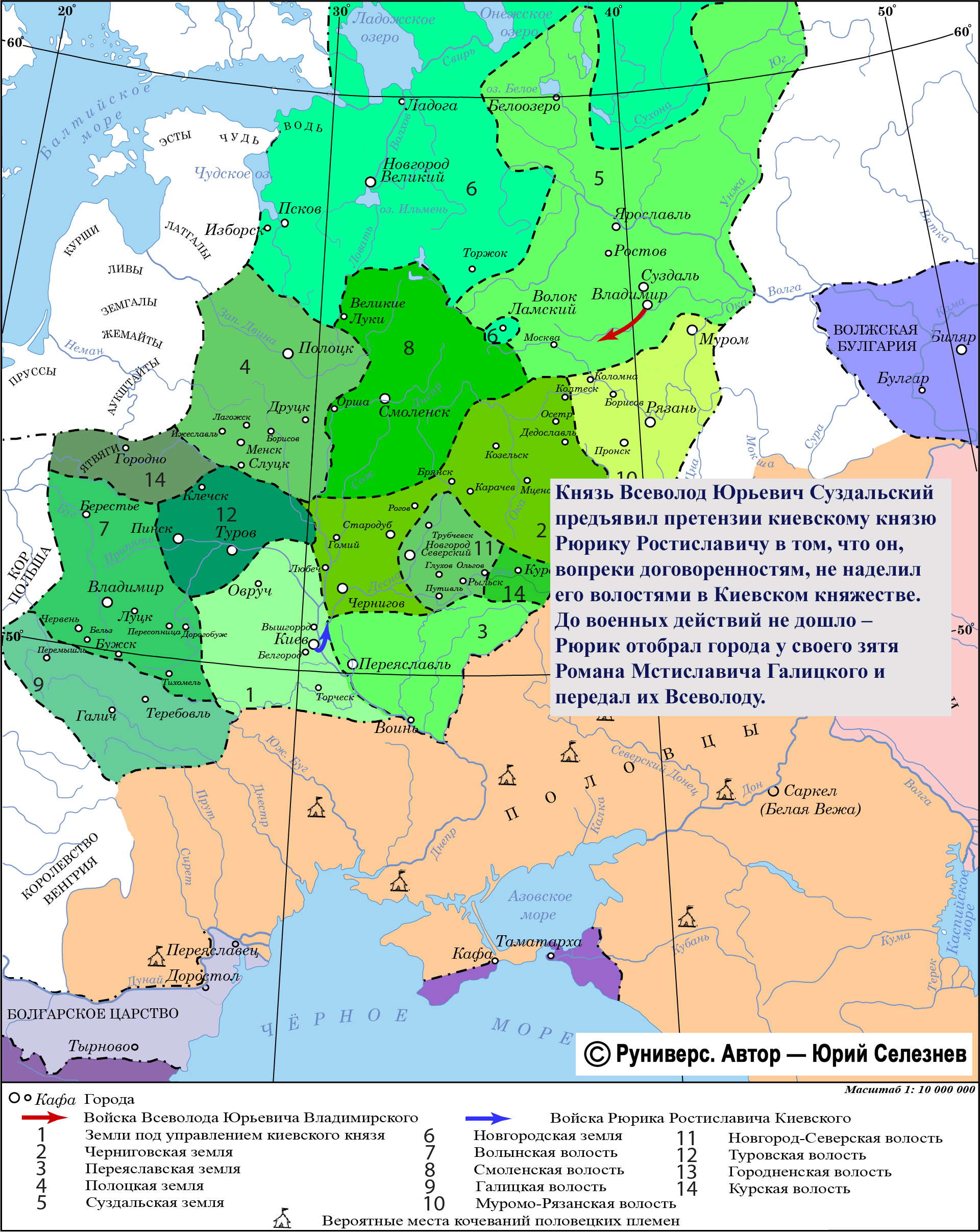 После смерти Святослава Всеволодовича великим князем стал князь Рюрик Ростиславич, которому князь Всеволод Юрьевич Суздальский предъявил претензии в том, что он, вопреки договоренностям, не наделил его волостями в киевском княжестве. Князья начали собирать войска, однако до военных действий не дошло – Рюрик отобрал города у своего зятя Романа Мстиславича Галицкого и передал их Всеволоду.