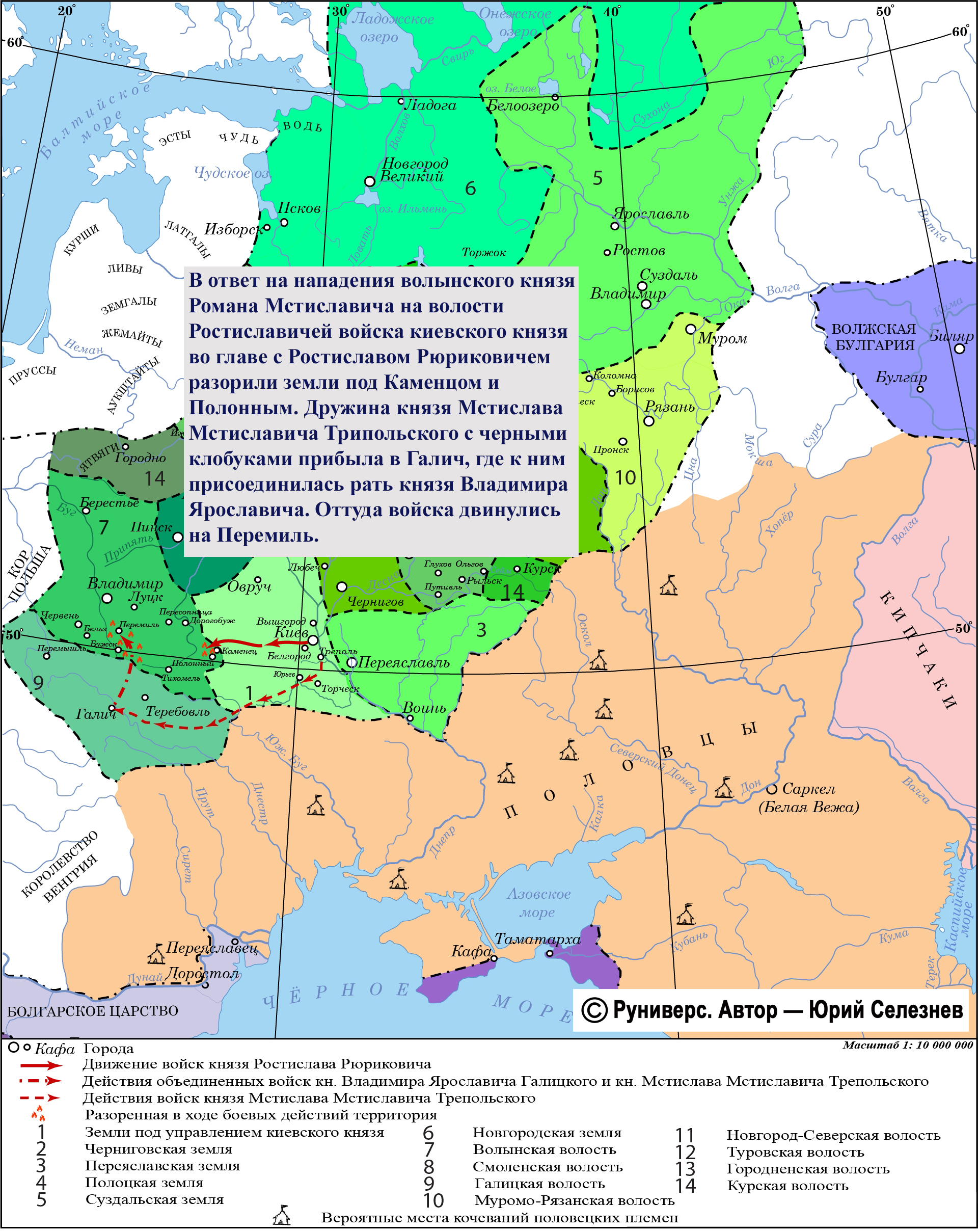 Продолжение усобицы Ольговичей и Ростиславичей. В ответ на нападения волынского князя Романа Мстиславича на волости Ростиславичей войска киевского князя во главе с Ростиславом Рюриковичем разорили земли под Каменцом и Полонным. Дружина князя Мстислава Мстиславича Трипольского с черными клобуками прибыла в Галич, где к ним присоединилась рать князя Владимира Ярославича. Оттуда войска двинулись на Перемиль. Князь Роман Мстиславич прекратил тревожить границы Киевского княжества.