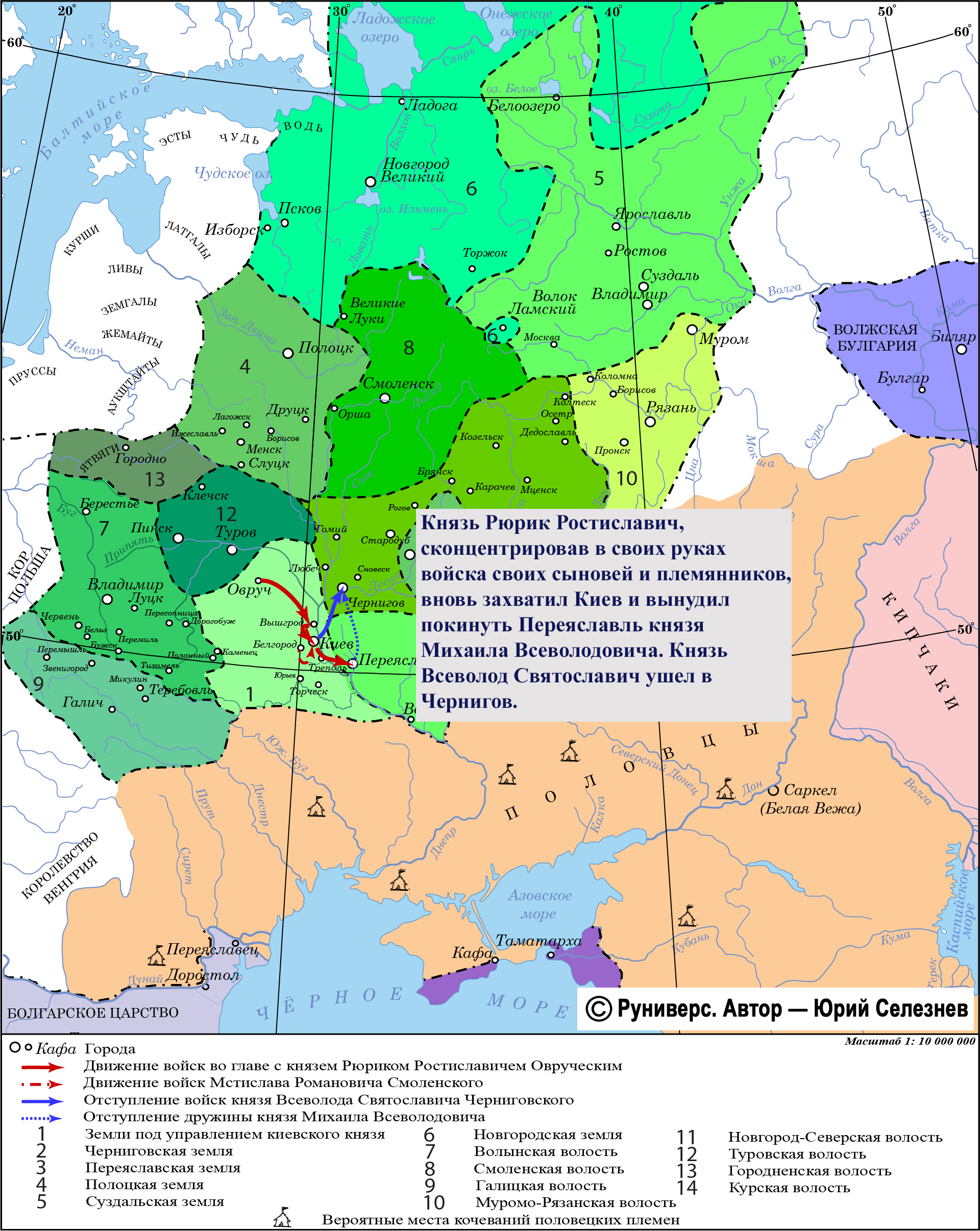 Продолжение усобицы Ольговичей и Ростиславичей. Князь Рюрик Ростиславич, сконцентрировав в своих руках войска своих сыновей и племянников, вновь захватил Киев и вынудил покинуть Переяславль князя Михаила Всеволодовича. Князь Всеволод Святославич ушел в Чернигов.
