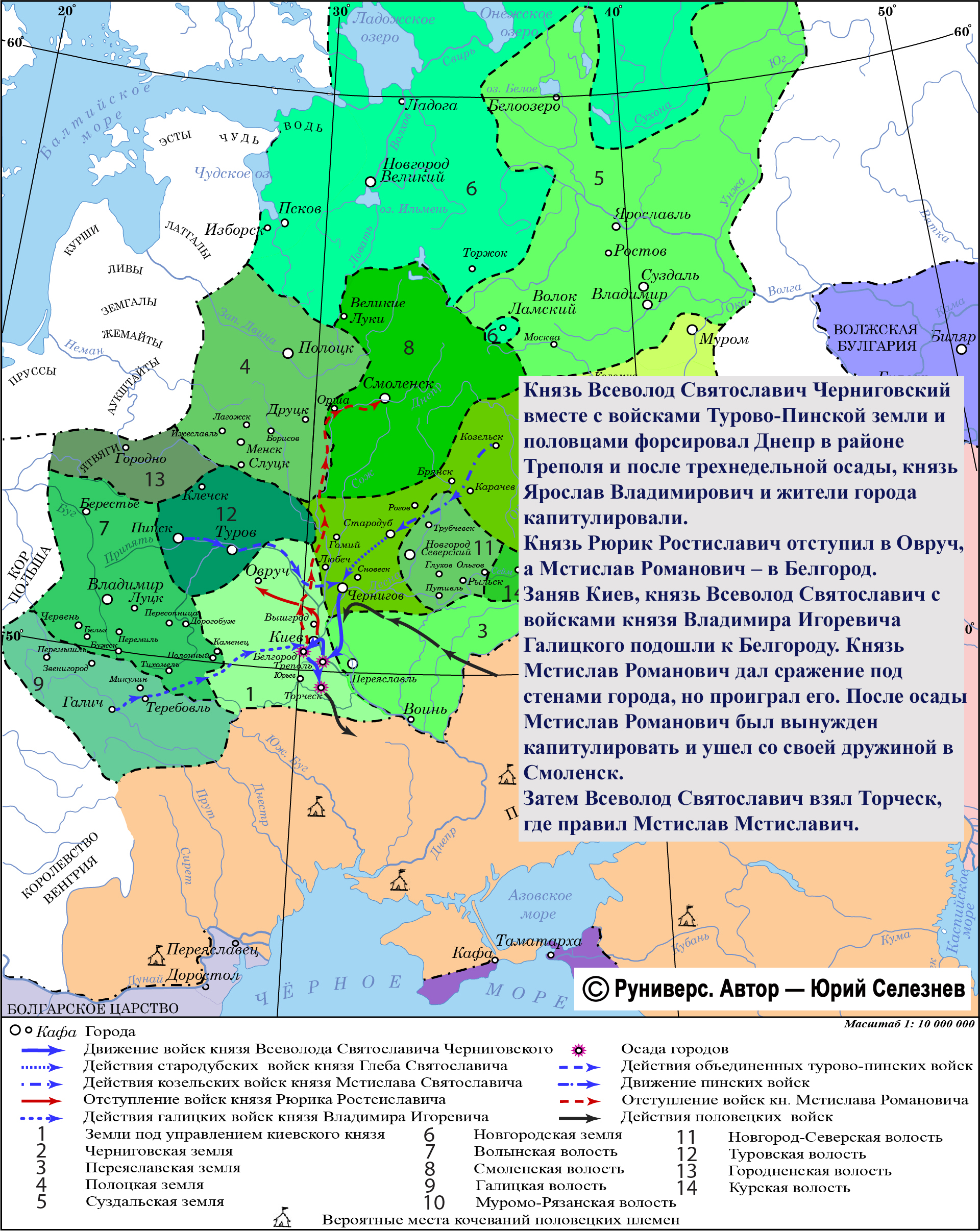 Продолжение усобицы Ольговичей и Ростиславичей. Перегруппировав силы, подтянув войска Турово-Пинской земли (князь Андрей Иванович Туровский, князь Владимир Глебович Пинский, князь Александр Глебович Дубровицкий), а также половцев, князь Всеволод Святославич Черниговский форсировал Днепр в районе Треполя и блокировал город. После трехнедельной осады князь Ярослав Владимирович и жители города капитулировали. За это время князь Рюрик Ростиславич отступил в Овруч, а Мстислав Романович – в Белгород. Таким образом, князь Всеволод Святославич получил возможность беспрепятственно войти в Киев, куда к нему подошли войска князя Владимира Игоревича Галицкого.