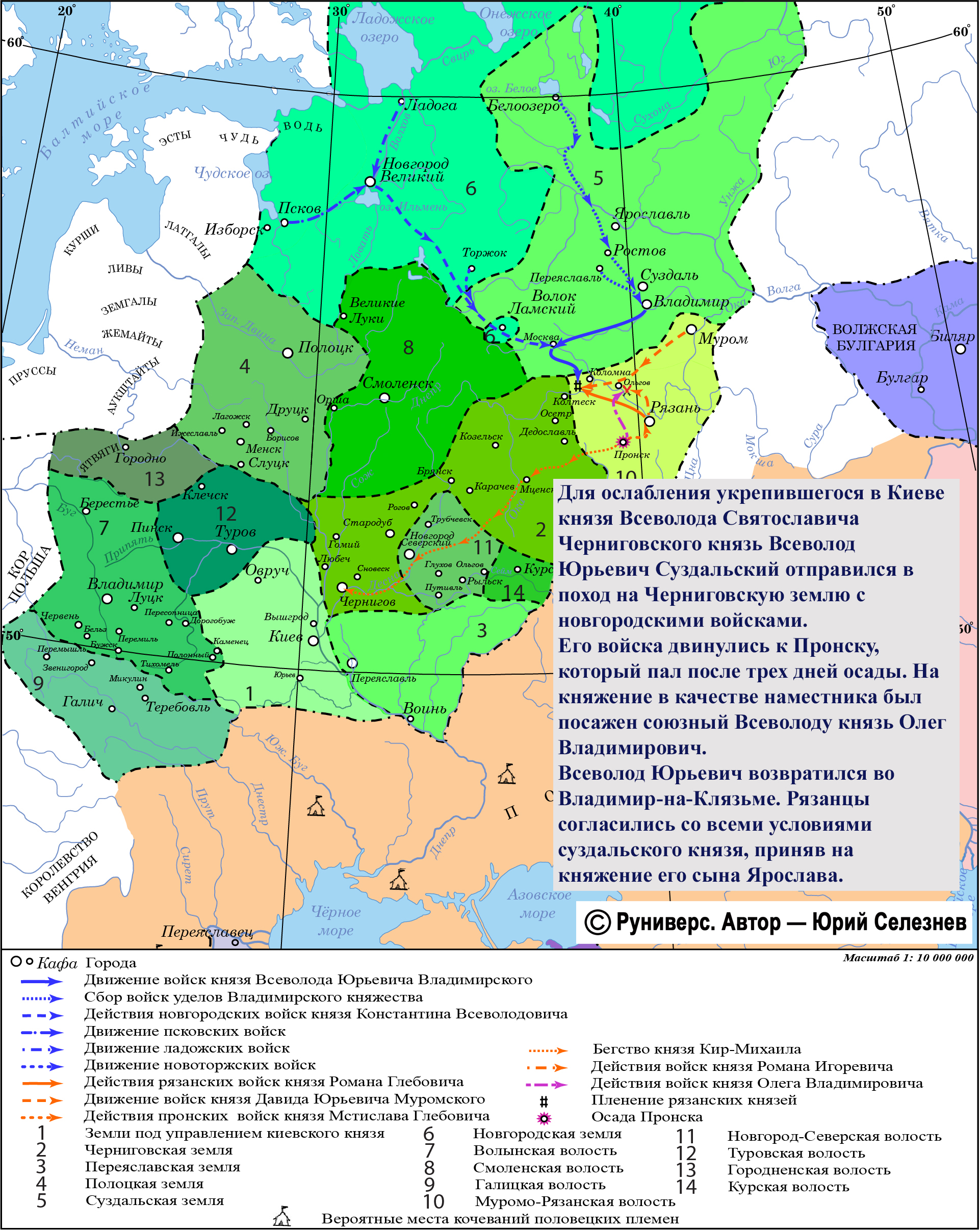 Укрепление в Киеве князя Всеволода Святославича Черниговского вызвало ответную реакцию князя Всеволода Юрьевича Суздальского, который отправился в поход на Черниговскую землю. Его войска с новгородскими полками двинулись к Пронску, который пал после трех дней осады. На княжение в качестве наместника был посажен союзный Всеволоду князь Олег Владимирович.