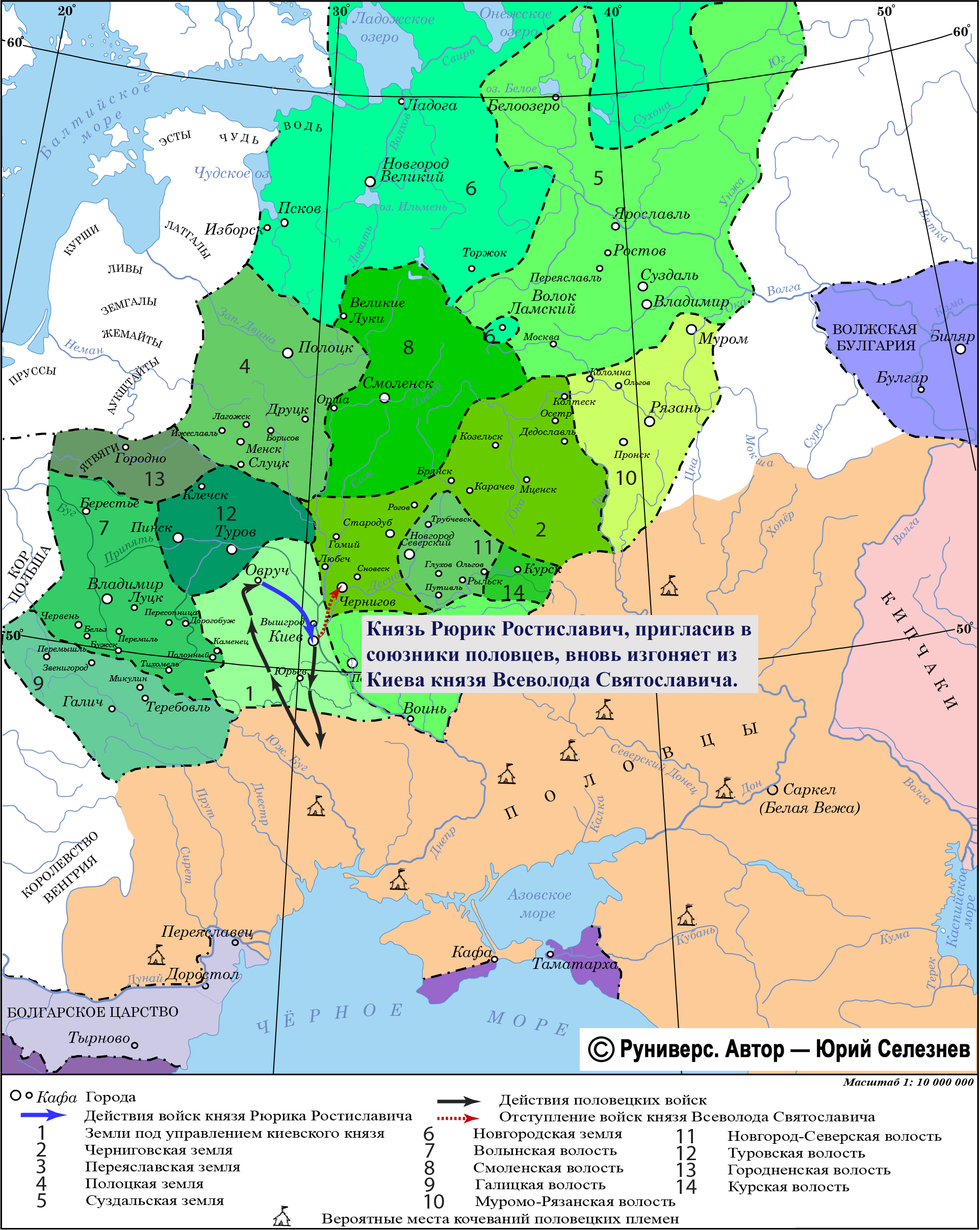 Продолжение усобицы Ольговичей и Ростилавичей. Князь Рюрик Ростиславич, пригласив в союзники половцев, вновь изгоняет из Киева князя Всеволода Святославича.