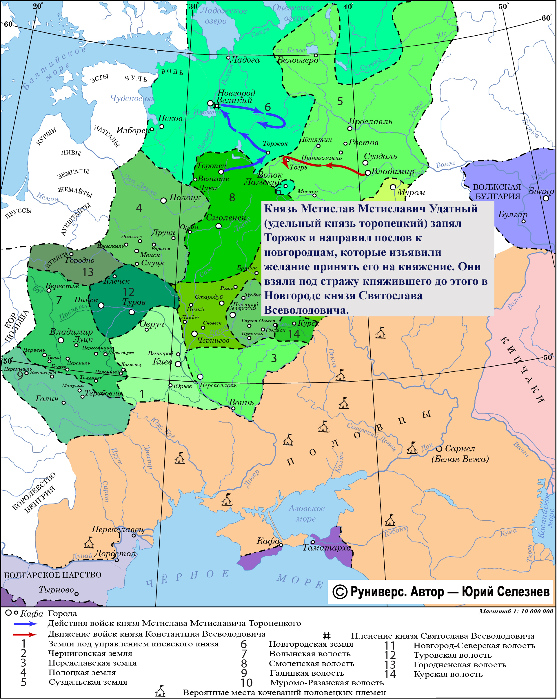 Борьба за новгородский стол. Князь Мстислав Мстиславич Удатный (удельный князь торопецкий) внезапным маневром занял Торжок и направил послов к новгородцам, которые изъявили желание принять его на княжение. Они взяли под стражу княжившего до этого в Новгороде князя Святослава Всеволодовича. Суздальский князь Всеволод Юрьевич в ответ приказал схватить в своем княжестве новгородских купцов.