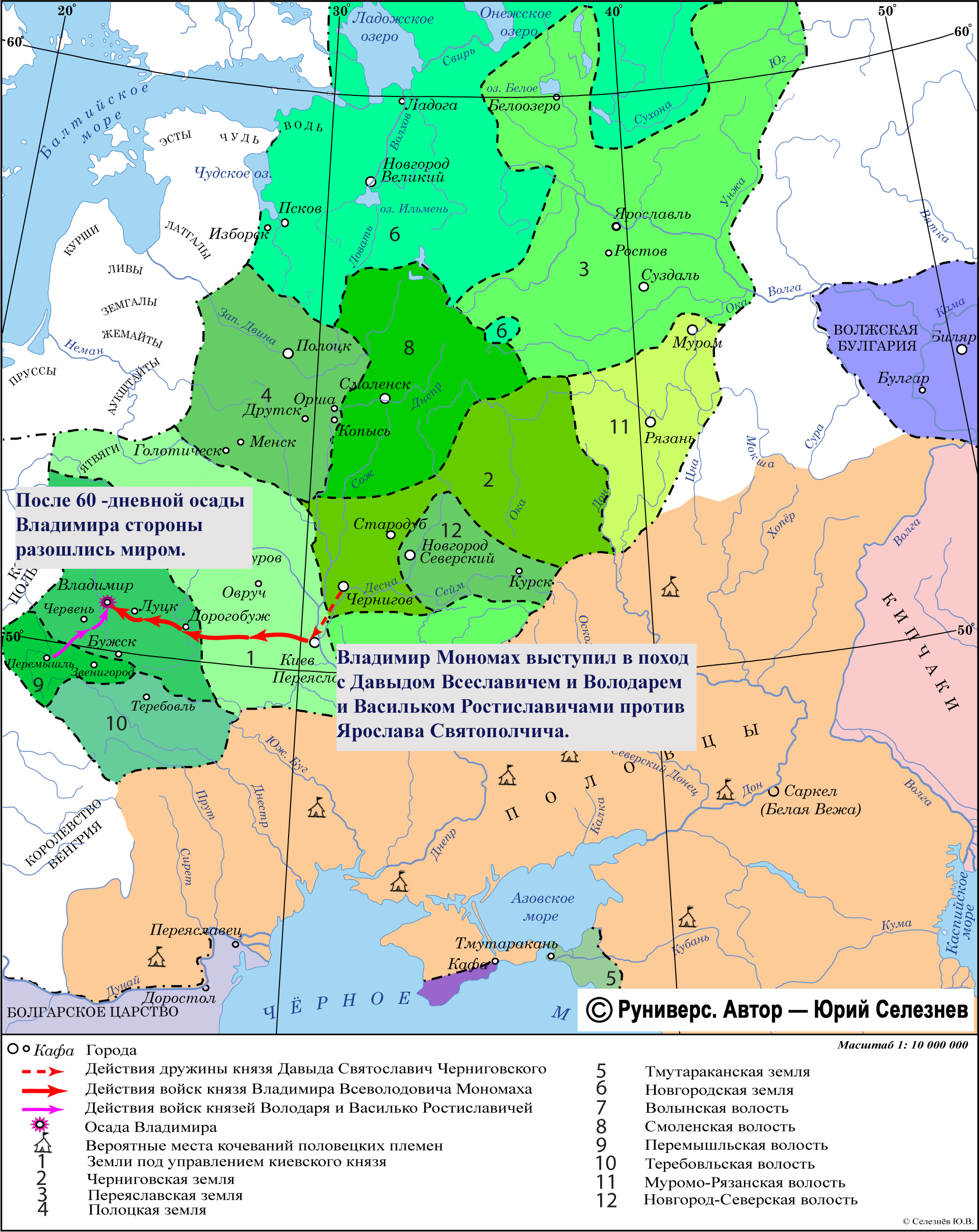 Владимир Мономах выступил в поход с Давыдом Всеславичем и Володарем и Васильком Ростиславичами против Ярослава Святополчича. После 60 -дневной осады Владимира стороны разошлись миром.