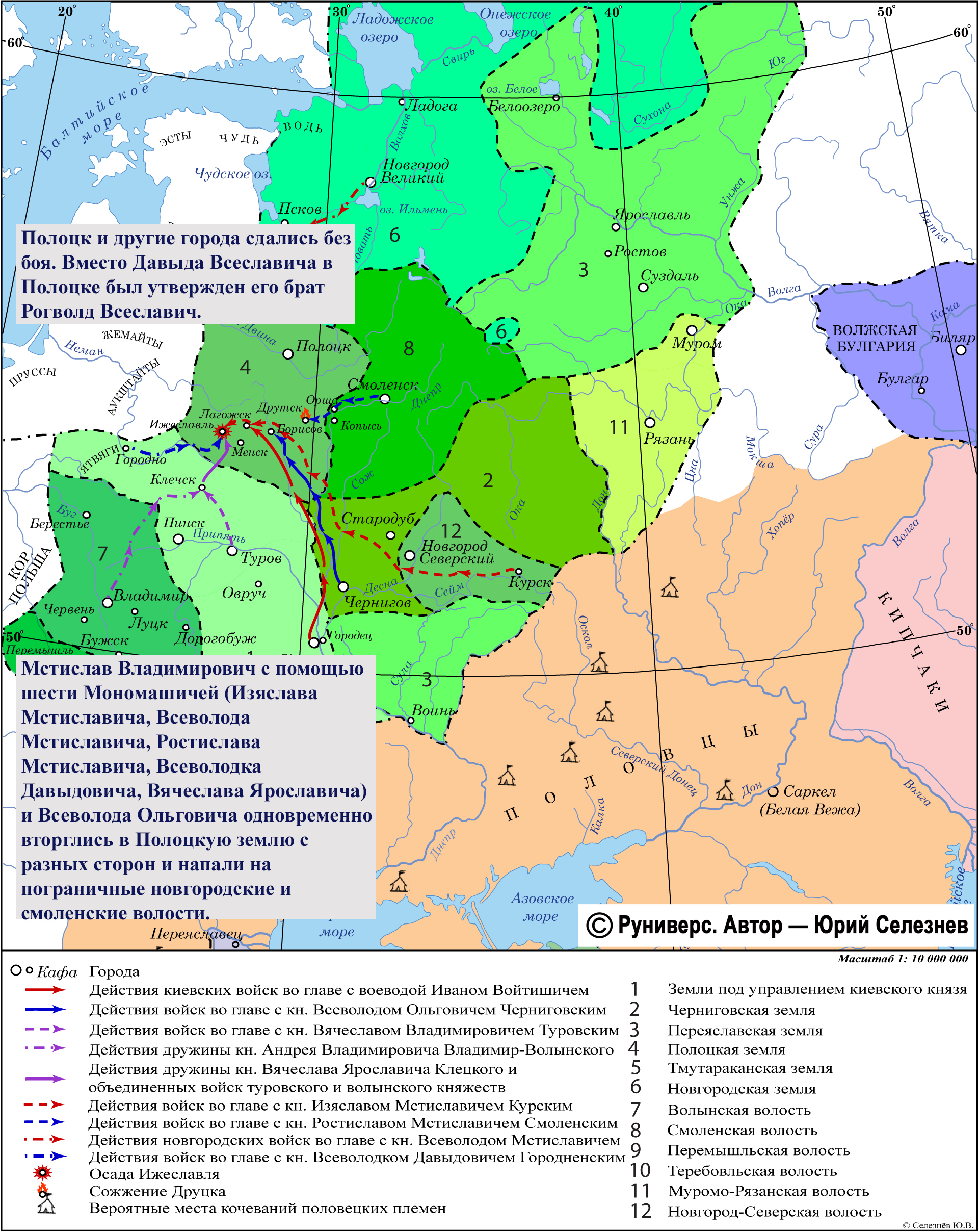 Мстислав Владимирович с помощью шести Мономашичей (Изяслава Мстиславича, Всеволода Мстиславича, Ростислава Мстиславича, Всеволодка Давыдовича, Вячеслава Ярославича) и Всеволода Ольговича одновременно вторглись в Полоцкую землю с разных сторон и напали на пограничные новгородские и смоленские волости. Полоцк и другие города сдались без боя. Вместо Давыда Всеславича в Полоцке был утвержден его брат Рогволд Всеславич.