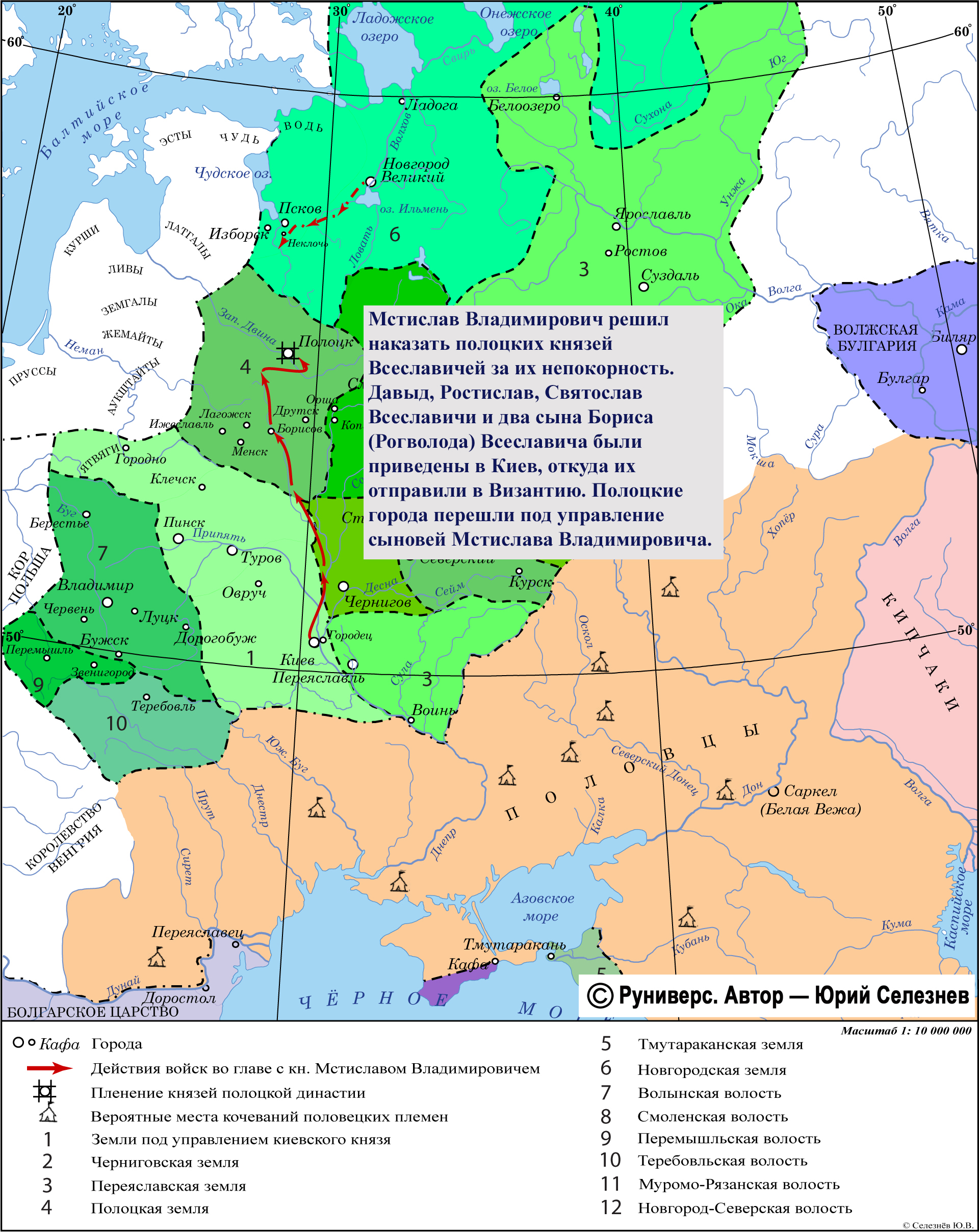 Мстислав Владимирович решил наказать полоцких князей Всеславичей за их непокорность. Давыд, Ростислав, Святослав Всеславичи и два сына Бориса (Рогволода) Всеславича были приведены в Киев, откуда их отправили в Византию. Полоцкие города перешли под управление сыновей Мстислава Владимировича.