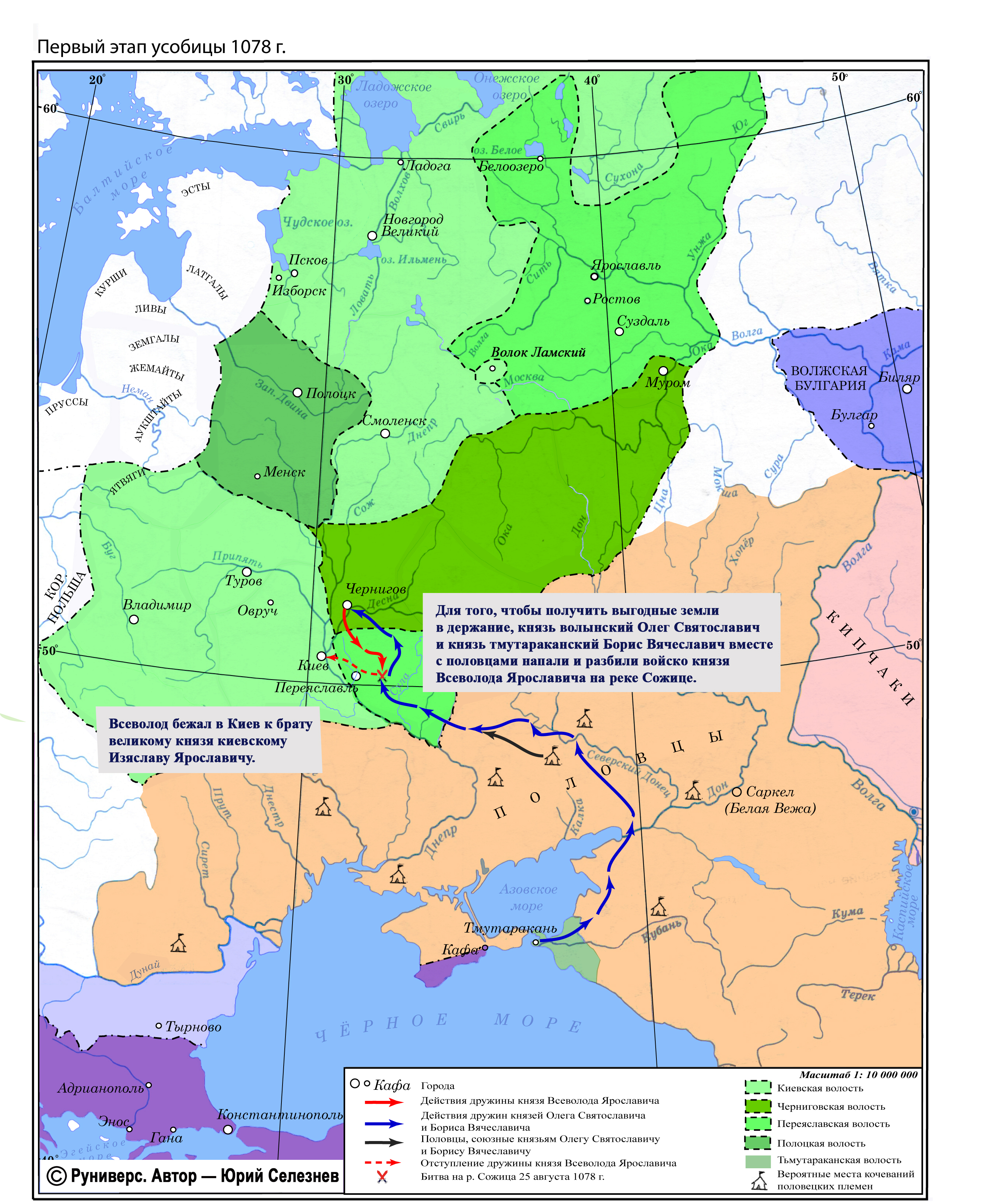 Для того, чтобы получить выгодные земли в держание, князь волынский Олег Святославич и князь тмутараканский Борис Вячеславич вместе с половцами напали и разбили войско князя Всеволода Ярославича на реке Сожице. Всеволод бежал в Киев к брату великому князя киевскому Изяславу Ярославичу.