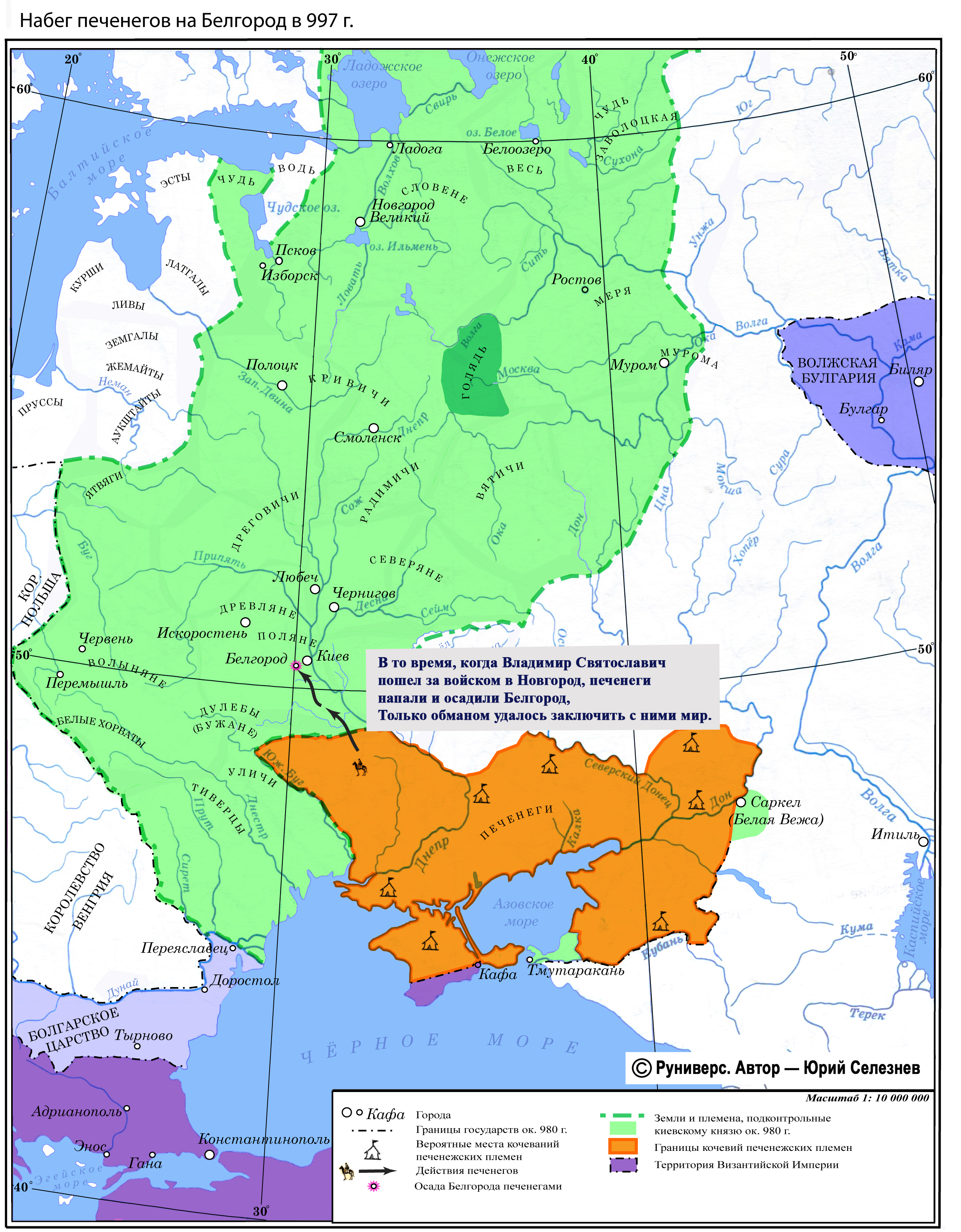 В то время, когда Владимир Святославич пошел за войском в Новгород, печенеги осадили Белгород.