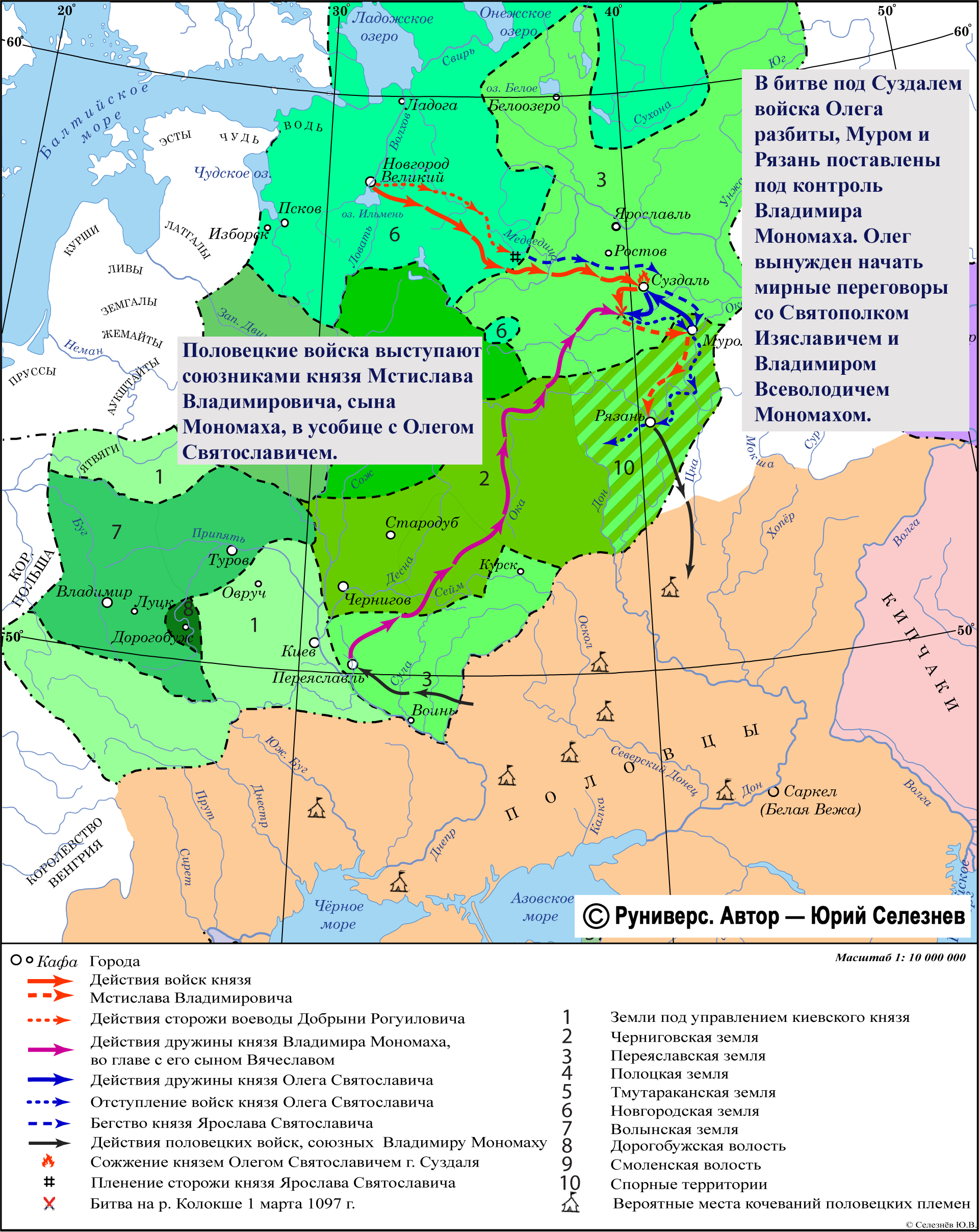 Половецкие войска выступают союзниками князя Мстислава Владимировича, сына Мономаха, в усобице с Олегом Святославичем.
