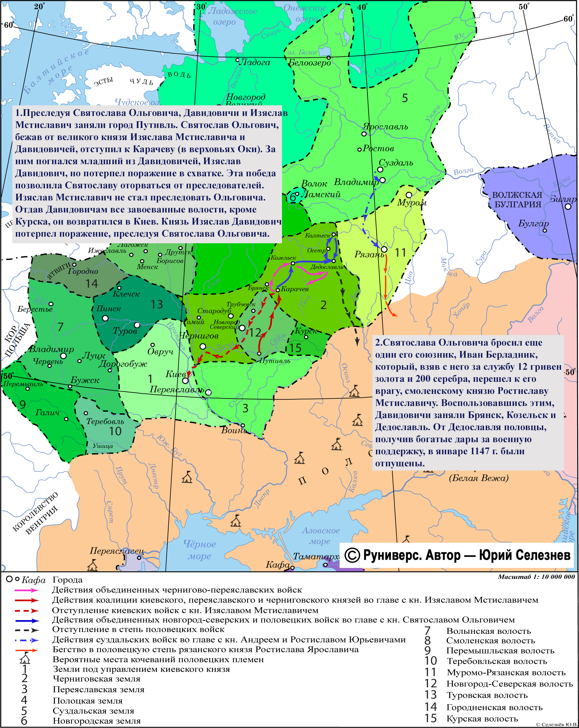 Святослава Ольговича бросил еще один его союзник, Иван Берладник, который, взяв с него за службу 12 гривен золота и 200 серебра, перешел к его врагу, смоленскому князю Ростиславу Мстиславичу. Воспользовавшись этим, Давидовичи заняли Брянск, Козельск и Дедославль. От Дедославля половцы, получив богатые дары за военную поддержку, в январе 1147 г. были отпущены.