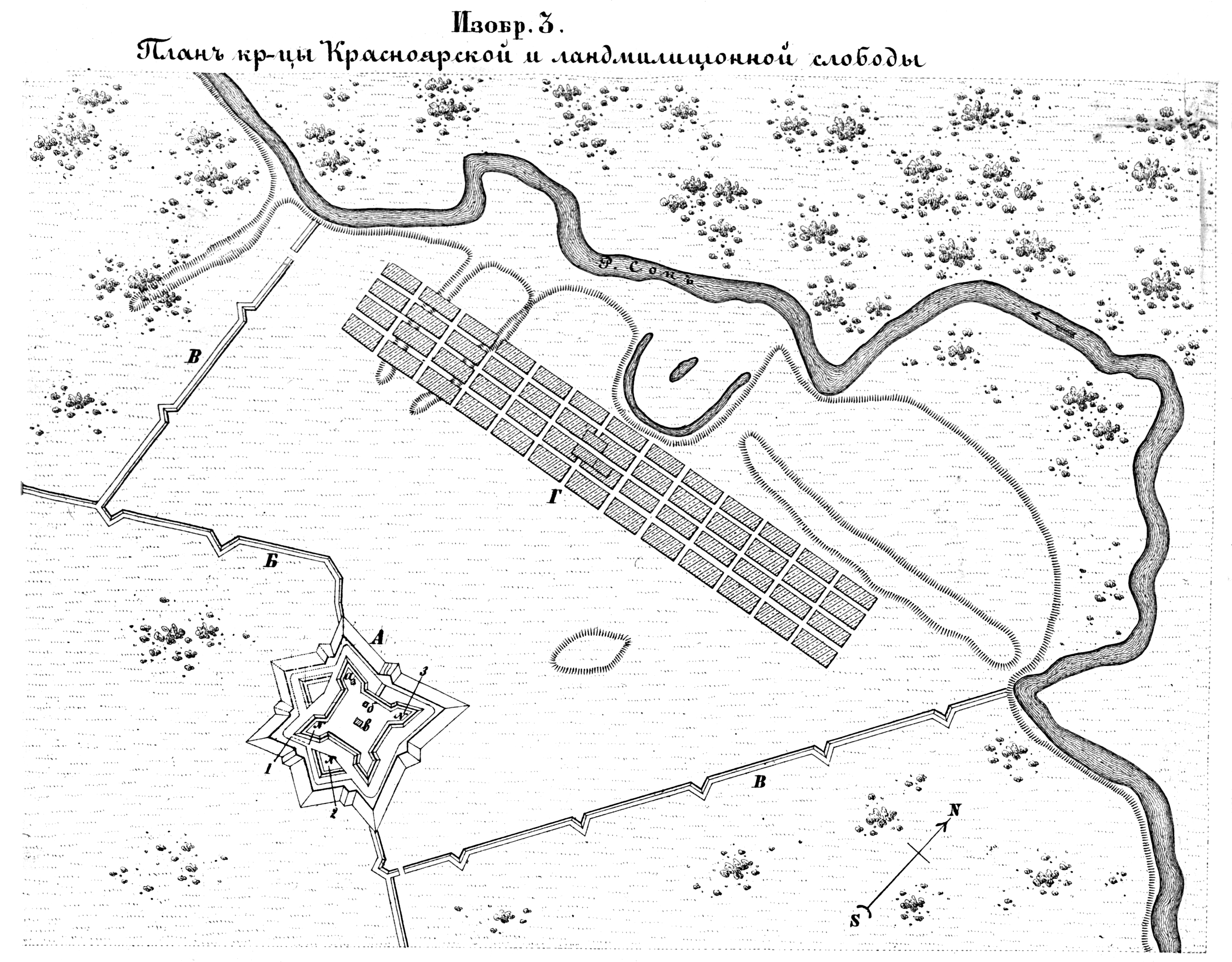 Пограничные линии. План крепостицы Красноярской и ландмилиционной слободы