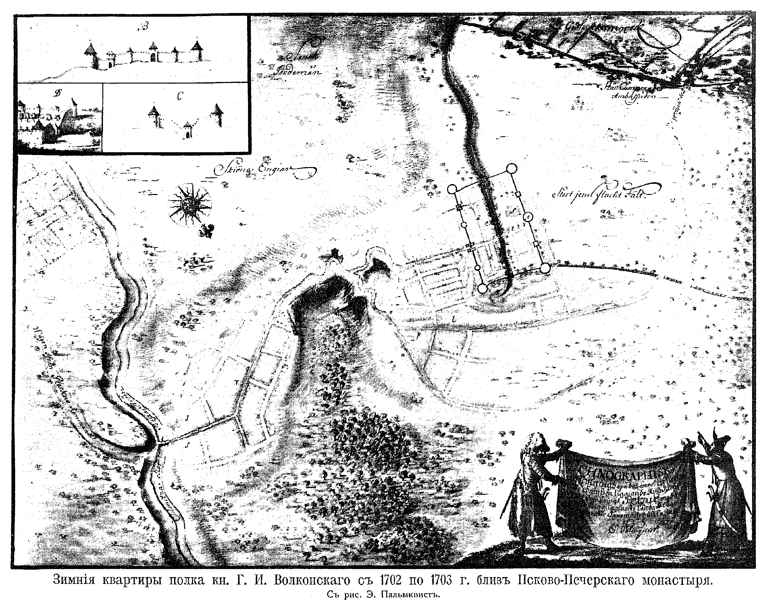 Зимние квартиры полка князя Г.И.Волконского с 1702 по 1703 год близ Псково-Печерского монастыря. С рисунка Э.Пальмквиста