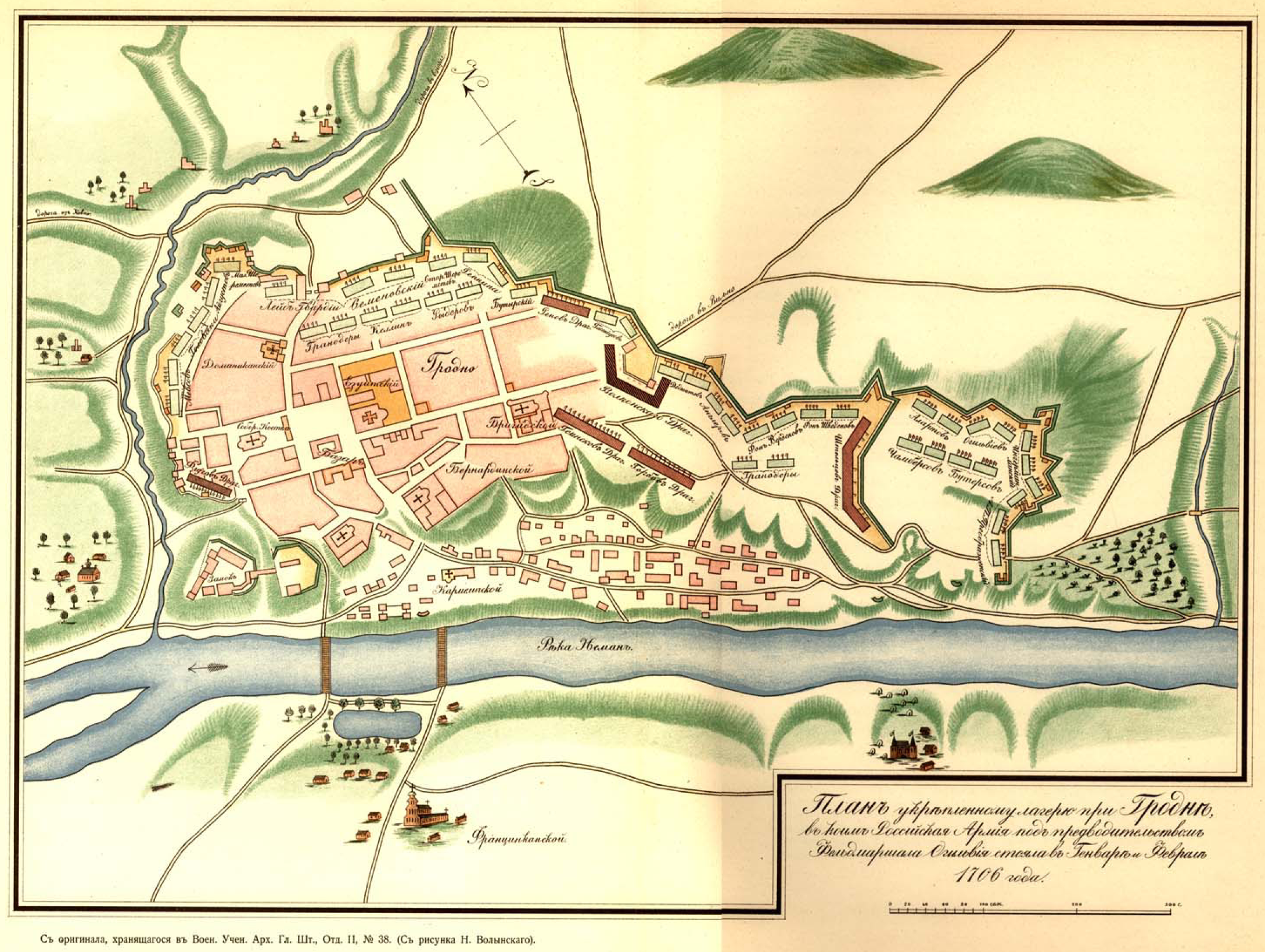 Укрепленный лагерь при Гродно, в коим Российская Армия под предводительством Фельдмаршала Огильвия стояла в январе и феврале 1706 года. С оригинала, хранящегося в Военном Ученом Архиве Главного Штаба, отд.II, №38. (С рисунка Н.Волынского)