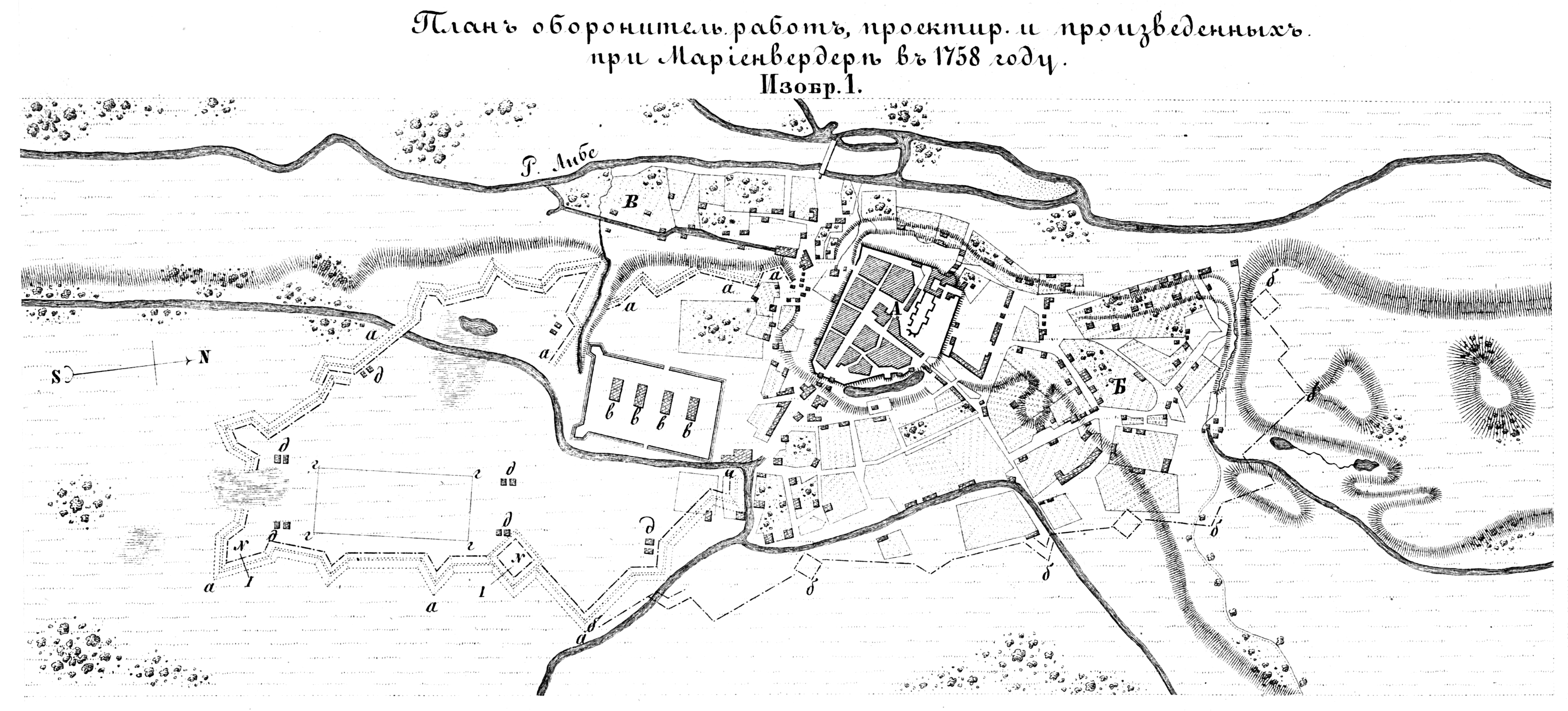 Полевые и временные укрепления. Изобр.1. План оборонительных работ, проектированных и произведенных при Мариенвердере в 1758 году