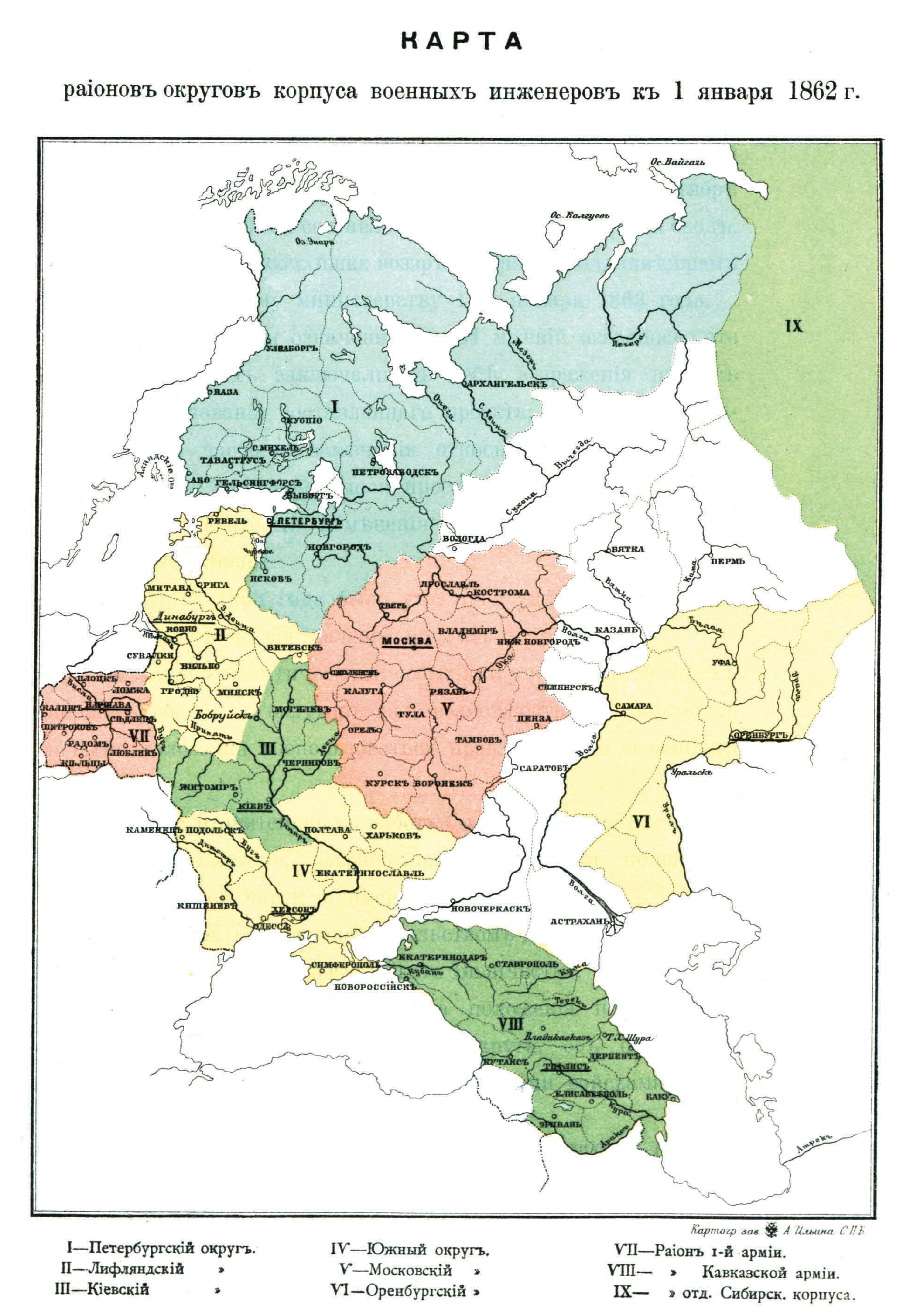 Районы округов корпуса военных инженеров к 1 января 1862 года