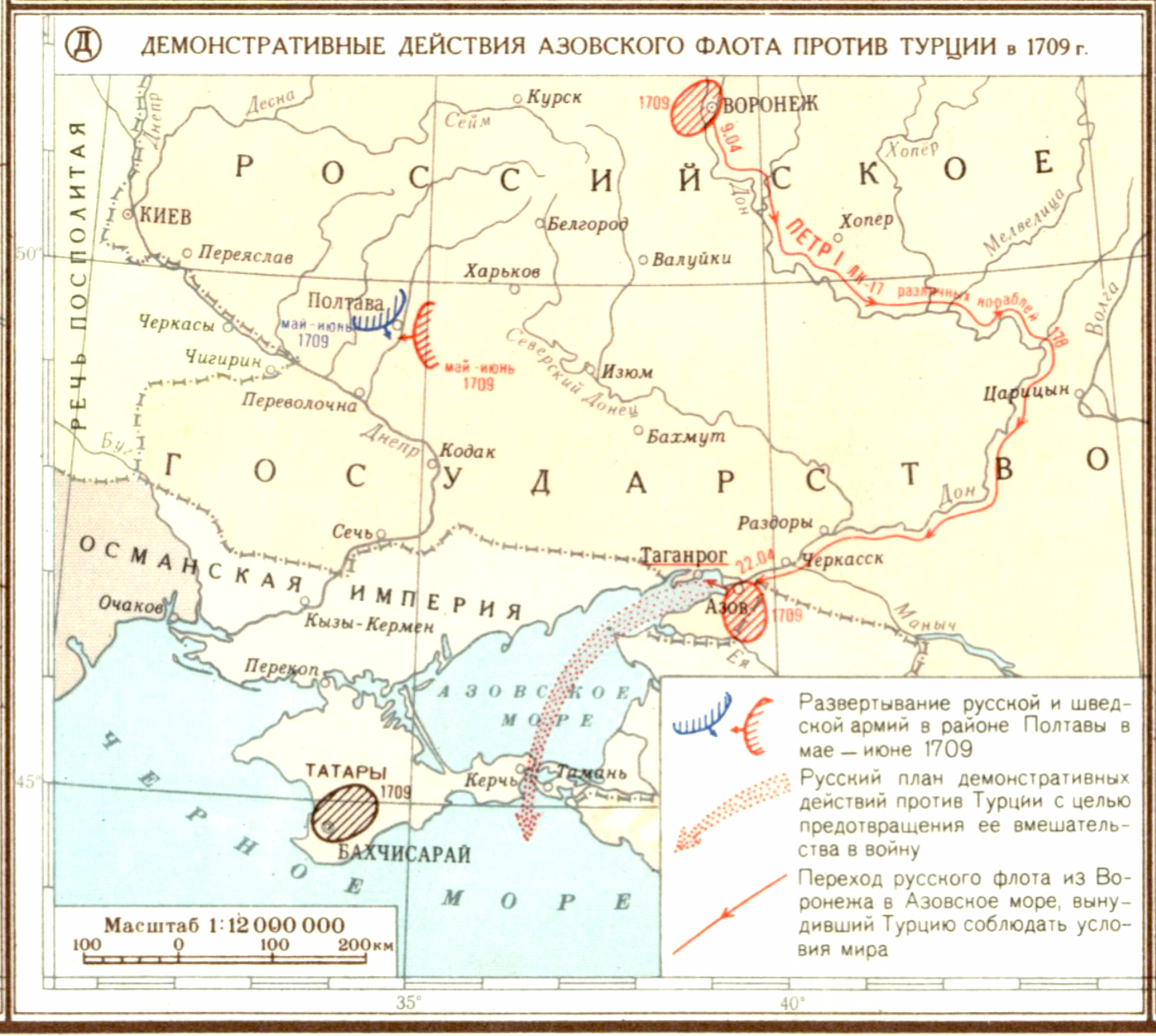 Северная война 1700-1721 гг. Отражение наступления шведской армии на Москву в 1708-1709 гг. Полтавское сражение. (Д) Демонстративные действия Азовского флота против Турции в 1709 г.