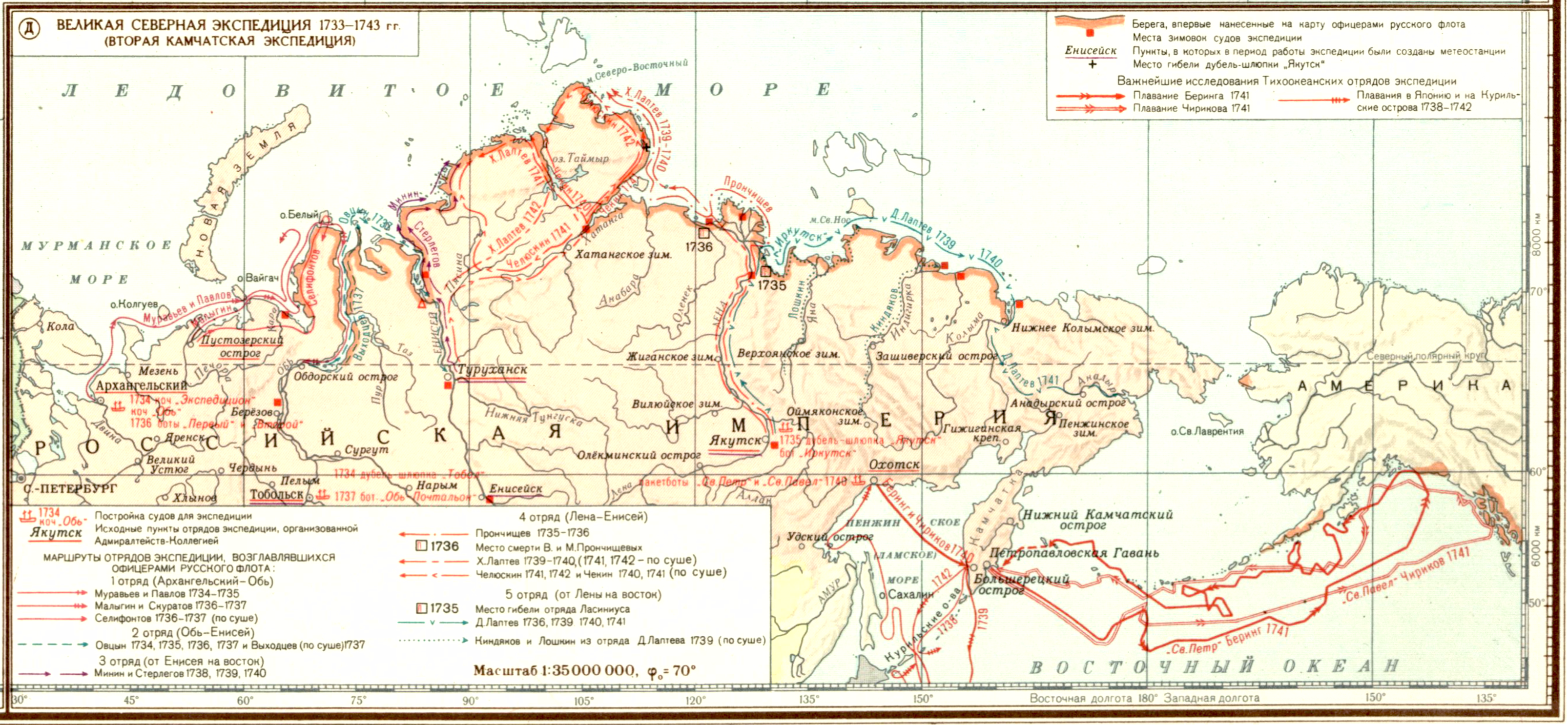 Великие русские географические открытия в Тихом и Северном Ледовитом океане в первой половине XVIIIв. (Д) Великая северная экспедиция 1733-1743 гг. (вторая Камчатская экспедиция).
