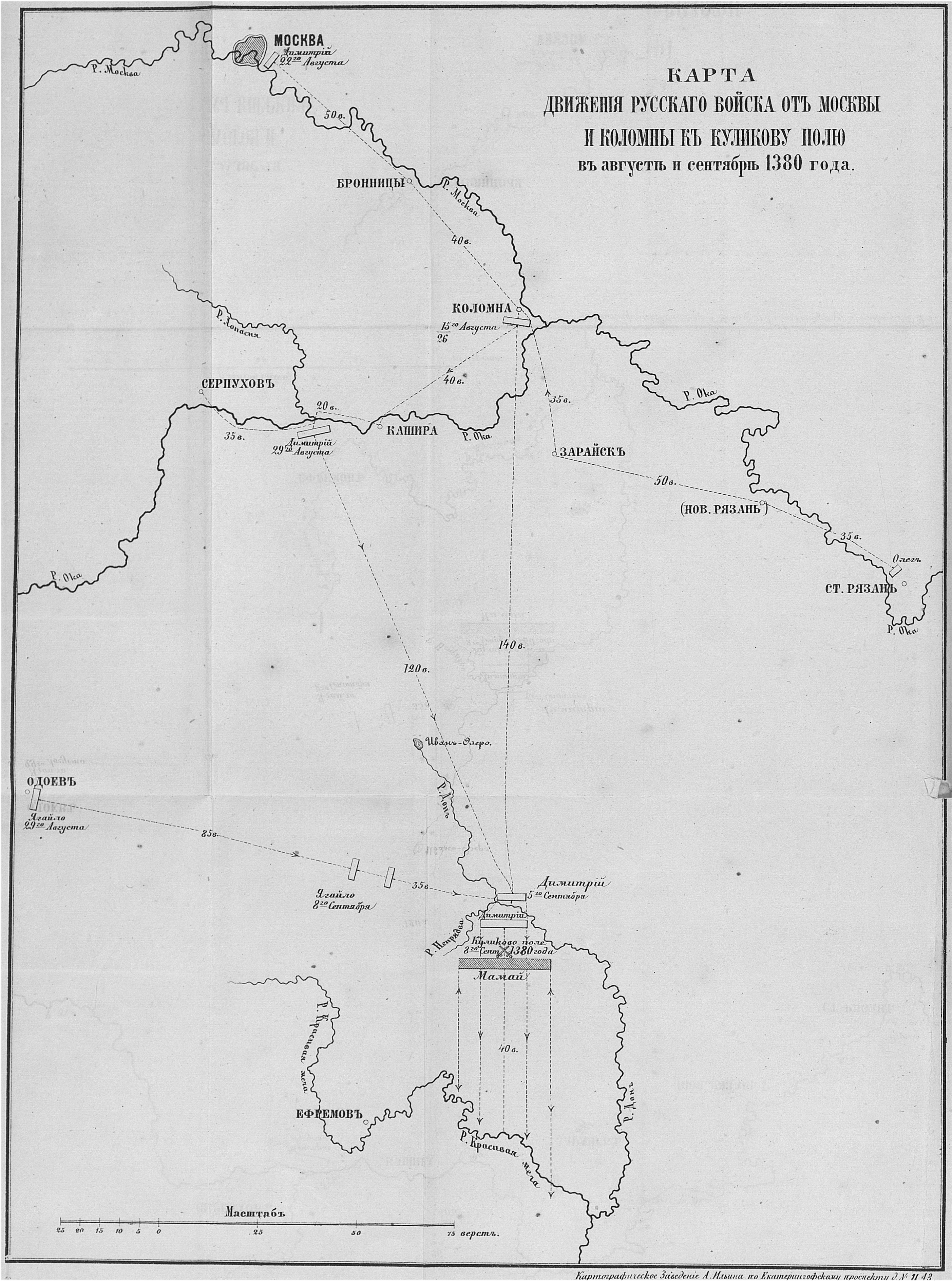 Карта движения русского войска от Москвы и Коломны к Куликову полю в августе и сентябре 1380 года.