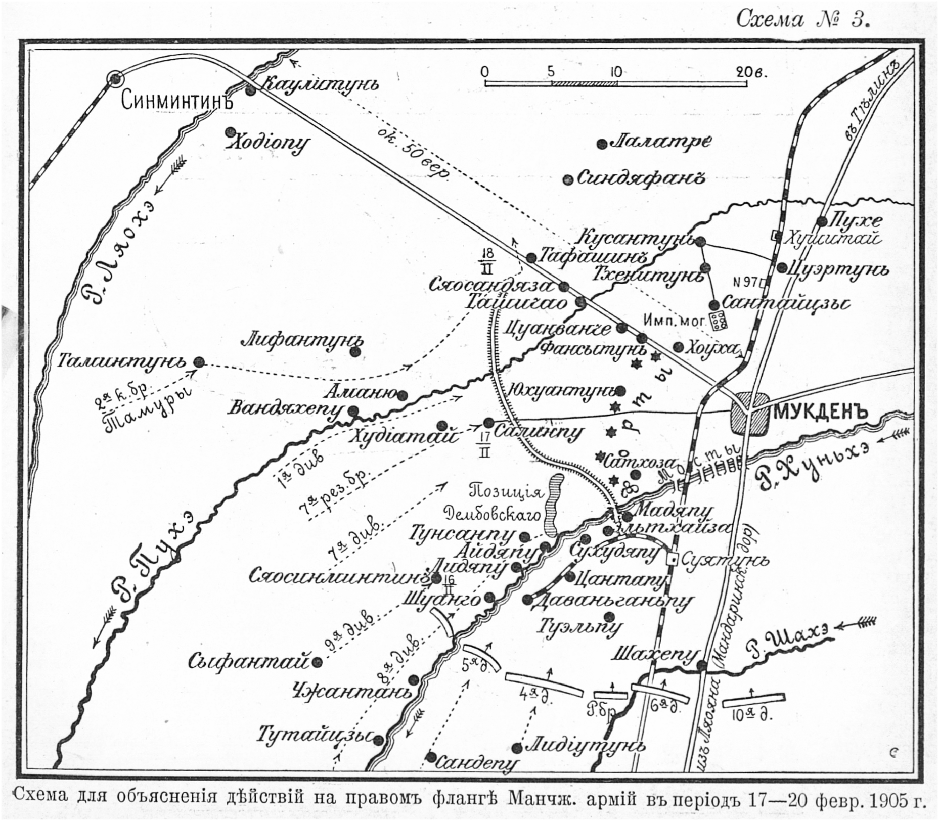 Мукден. Схема для объяснения действий на правом фланге Манчжурских армий в период 17-20 февраля 1905 года