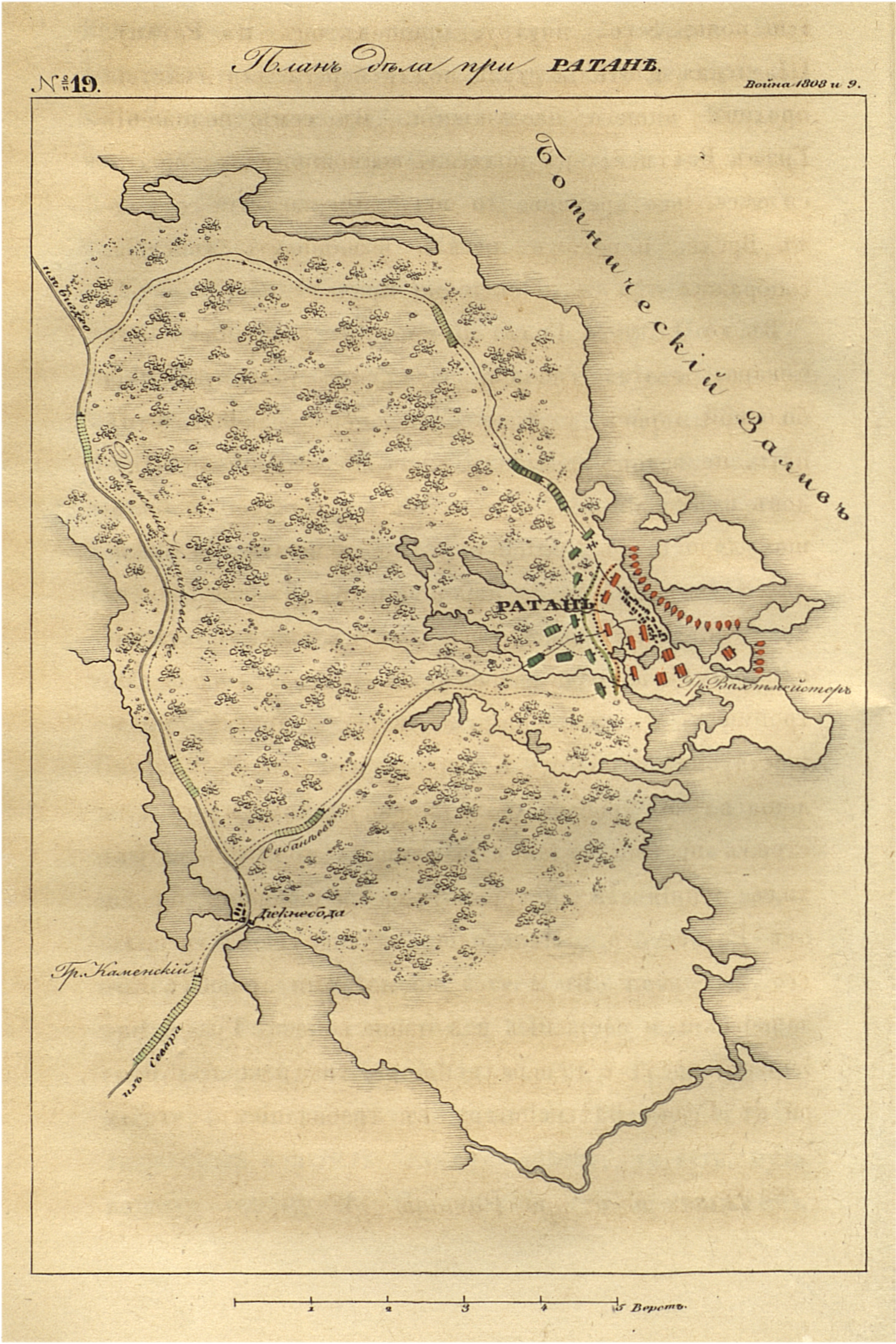 Тесня Шведских стрелков, наши заняли Ратан и стреляли оттуда по судам. Шведы поспешно обратились к своему Флоту и открыли с него сильный пушечный огонь, препятствуя нам подаваться вперед и преследовать неприятеля, садившегося на суда...