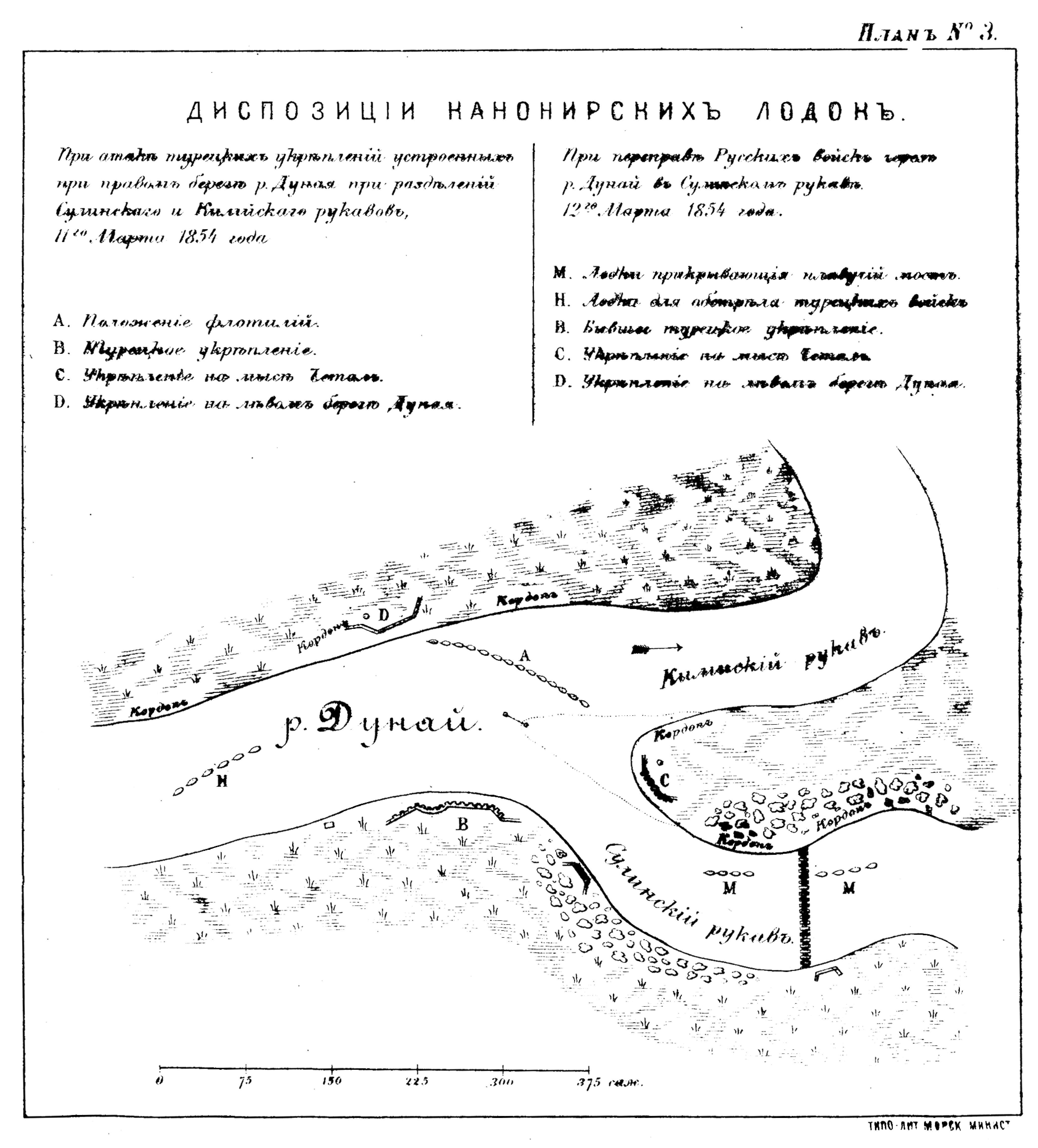 Диспозиция канонирских лодок при атаке турецких укреплений устроенных при правом берегу реки Дуная при разделении Сулинского и Килийского рукавов, 11 марта 1854 года