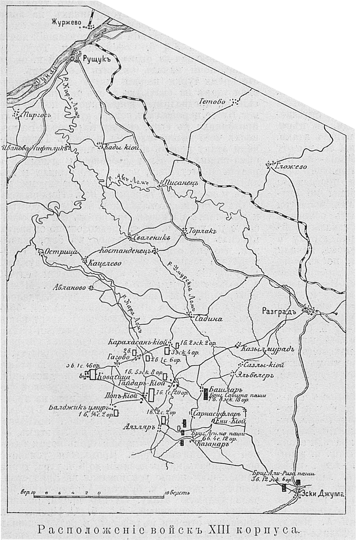 Расположение войск XIII корпуса у Аясляра 10-11 августа 1877 года