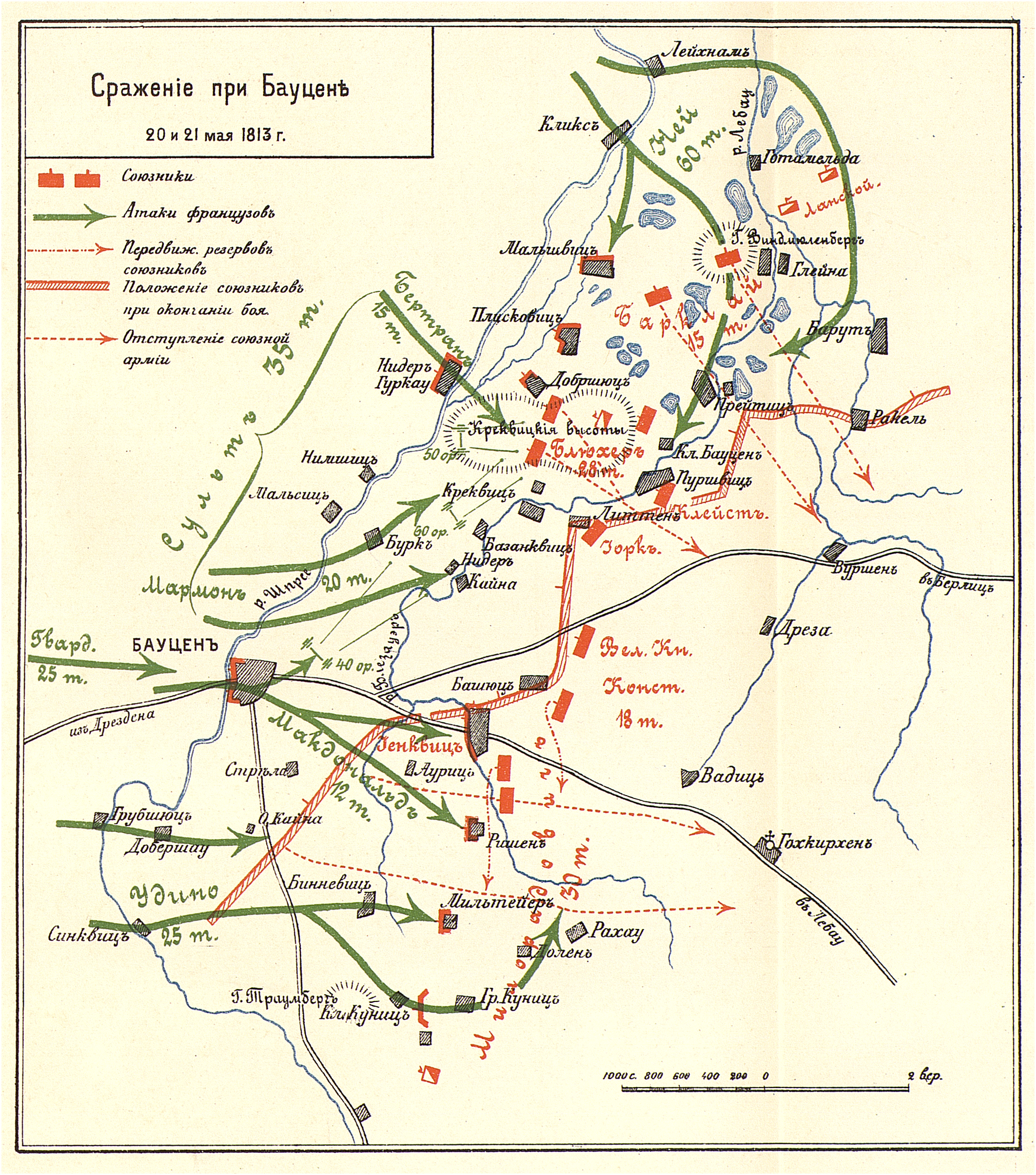 Сражение 8 (20) и 9 (21) мая 1813 г. После неудачного боя под Люценом союзная русско-прусская армия гр. Витгенштейна переправилась за р. Эльбу и отошла на заблаговременно укрепленную позицию у Бауцена. Здесь по политическим причинам было решено дать сражение Наполеону.