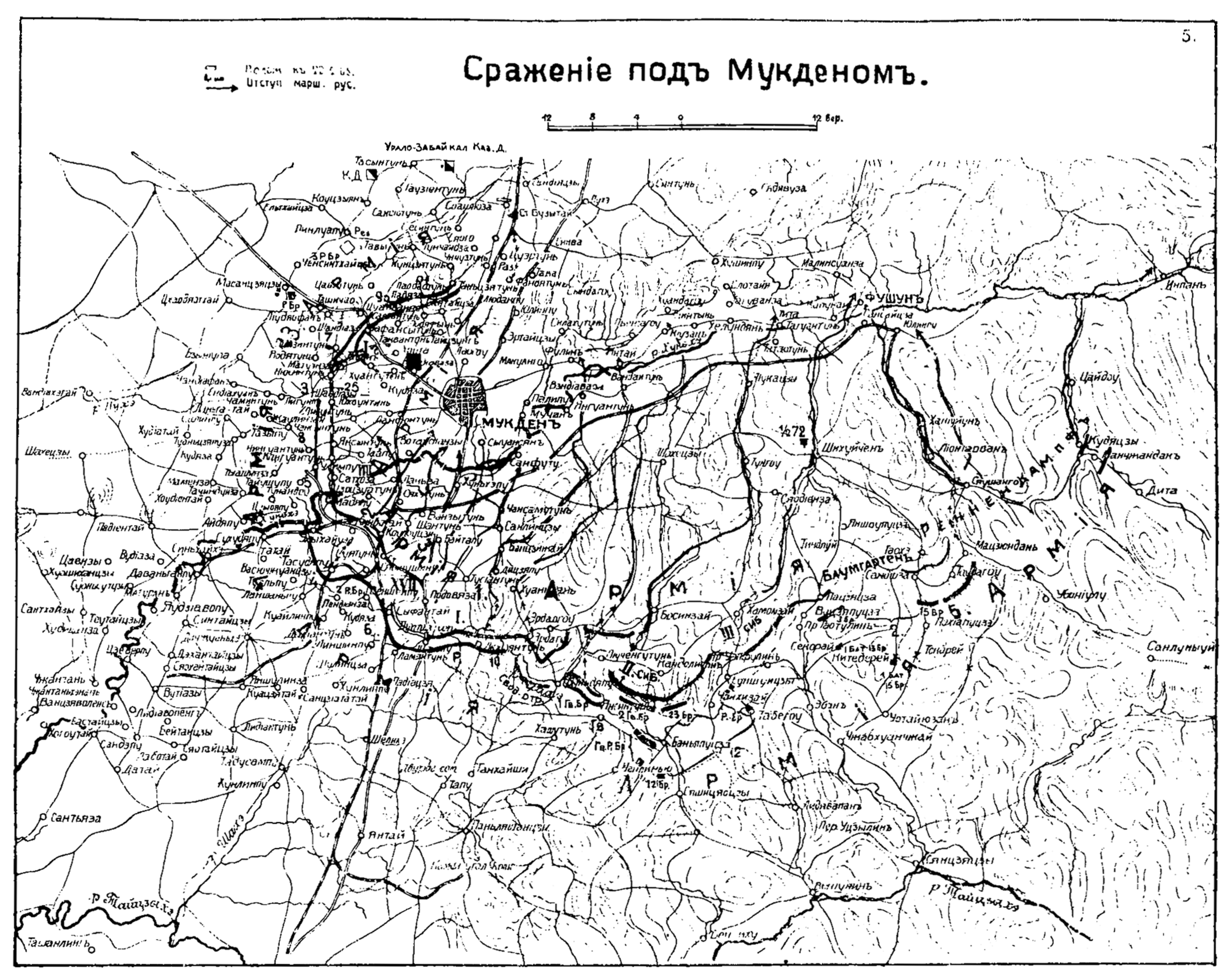 Сражение под Мукденом. Положение 22 февраля 1905 года. Маршрут отступления русских