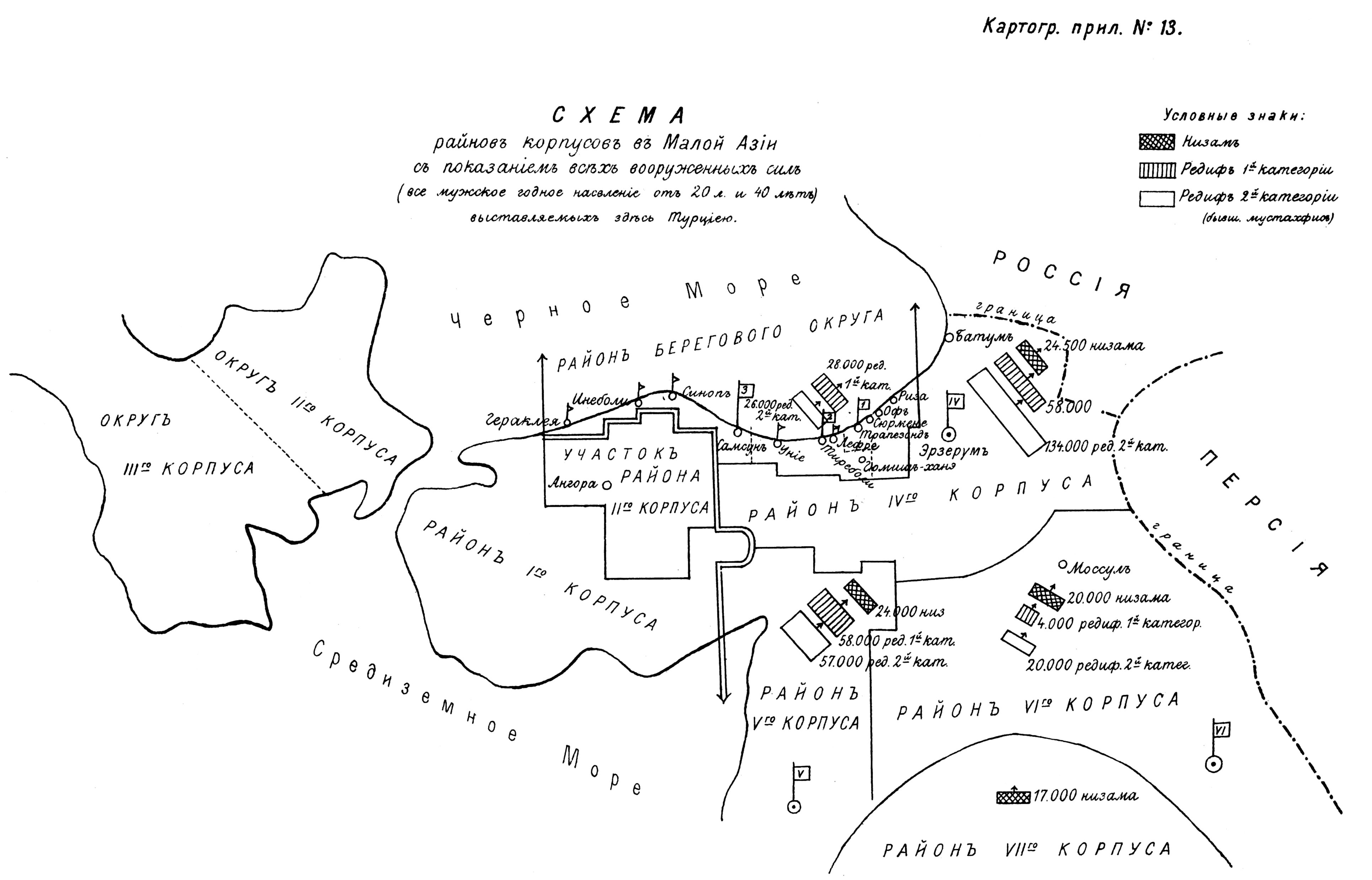 Районы корпусов в Малой Азии с показанием всех вооруженных сил (все мужское годное население от 20 до 40 лет) выставляемых здесь Турцией