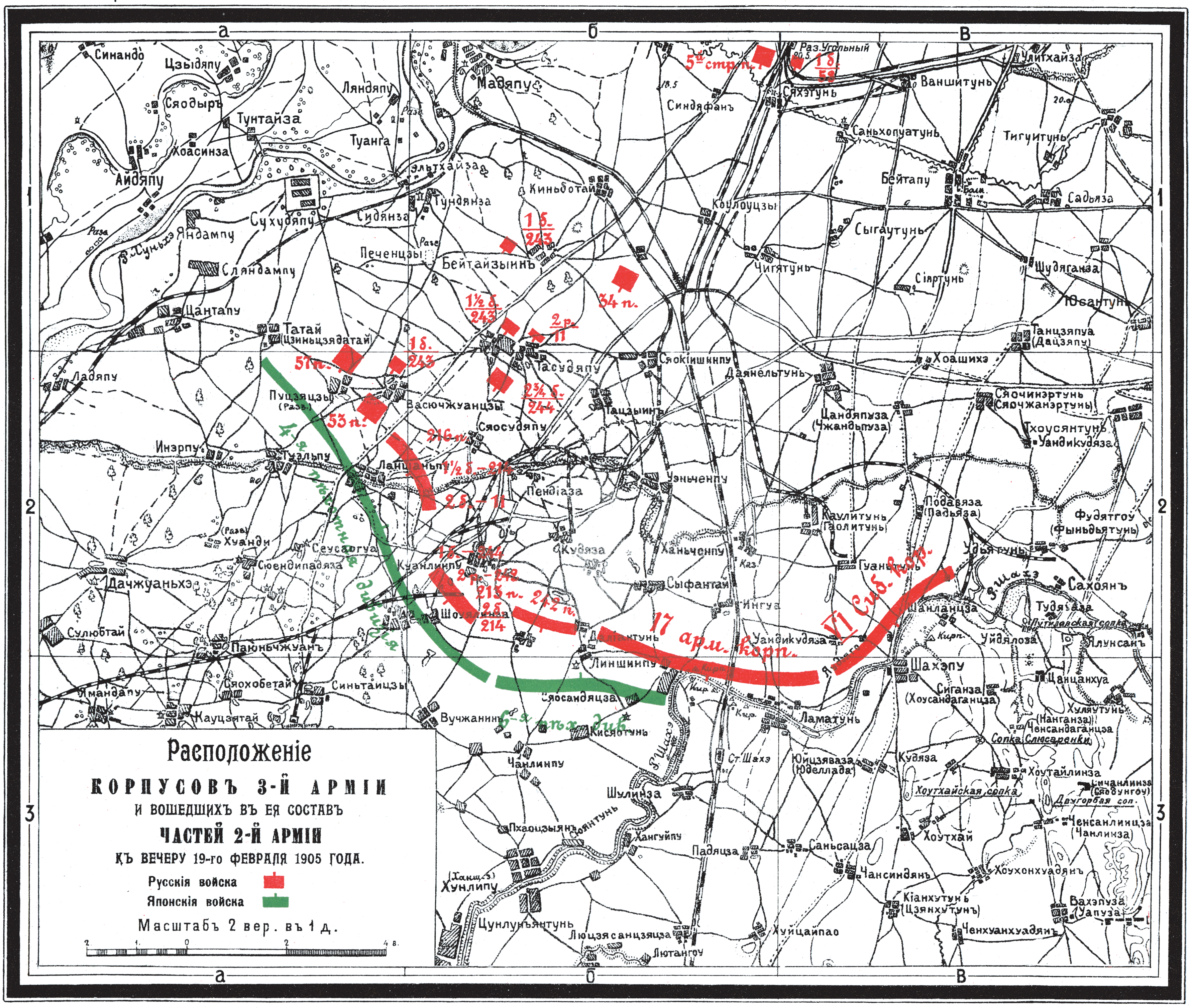Расположение корпусов 3 армии и вошедших в ее состав частей 2 армии к вечеру 19 февраля 1905 года
