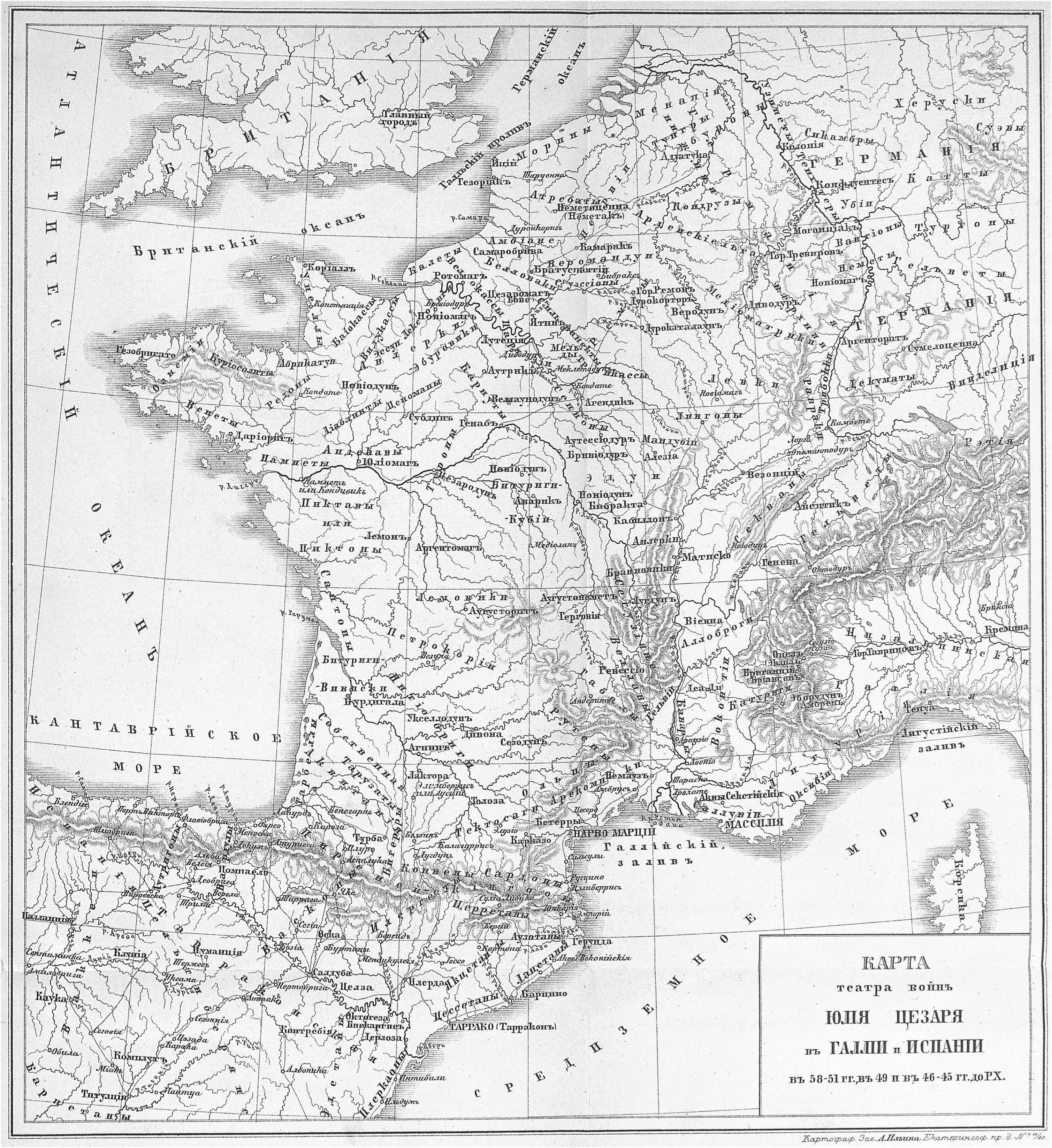 Карта театра войн Юлия Цезаря в Галлии и Испании в 58-51 гг, в 49 и в 46-45 гг до Р.Х.