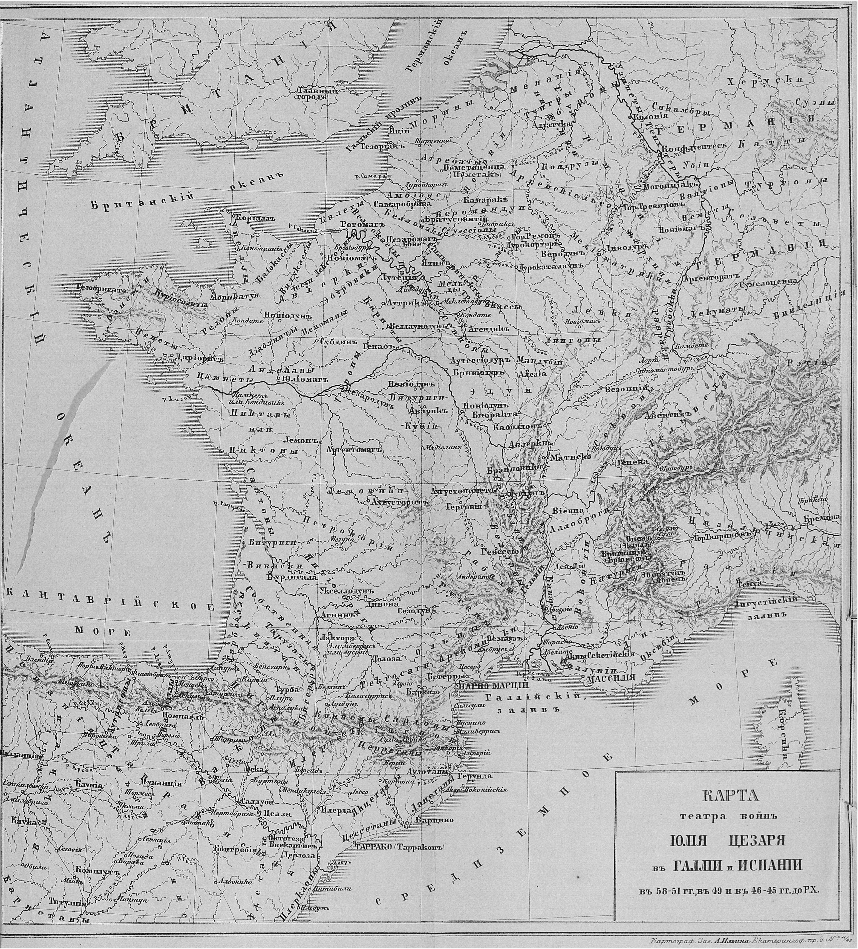 Карта театра войн Юлия Цезаря в Галлии и Испании в 58-51, в 49 и в 46-45гг. перед Р.Х.