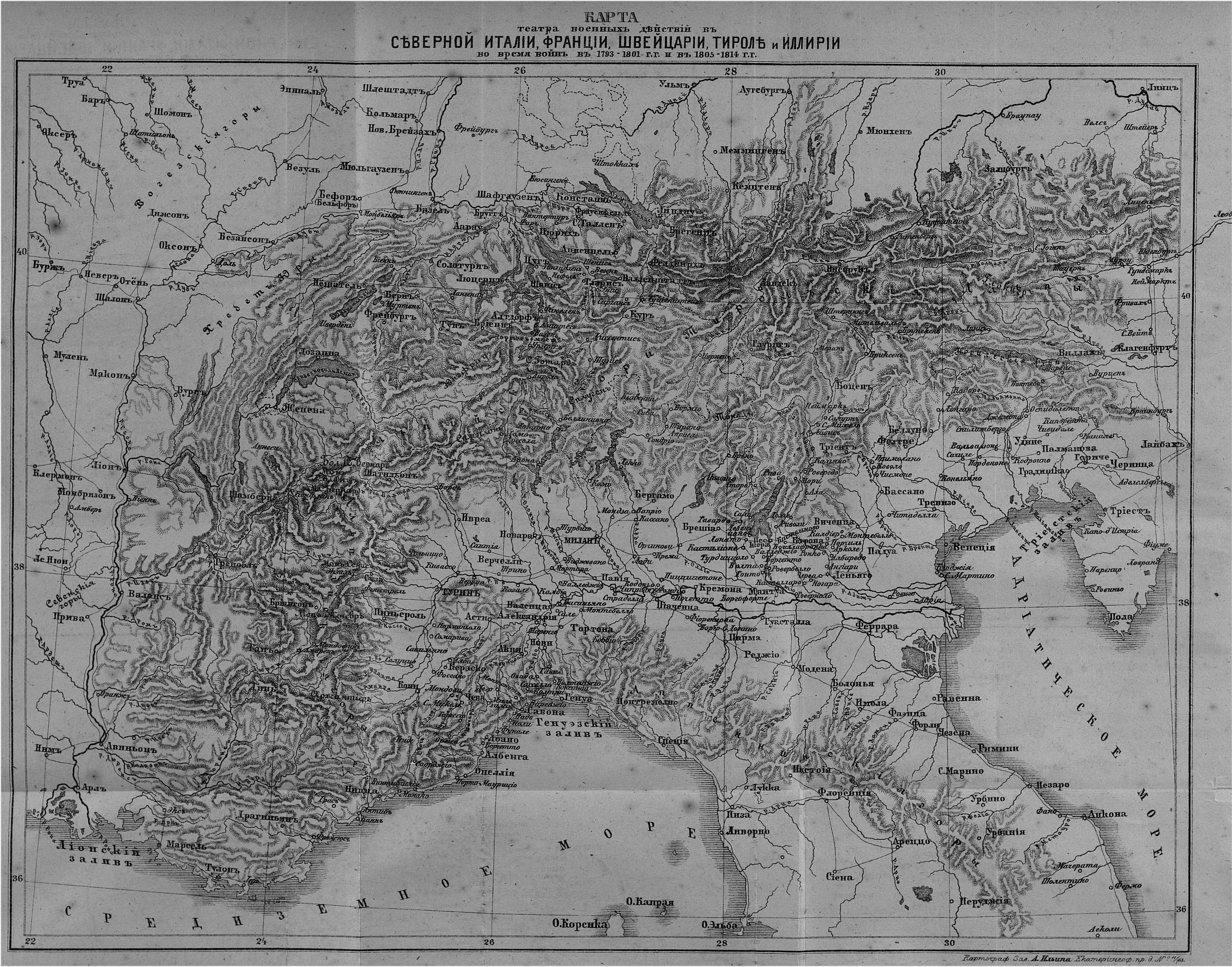 Карта театра военных действий в Италии, Франции, Швейцарии, Тироля и Иллирии во время войн в 1793-1801гг и в 1805-14 гг.