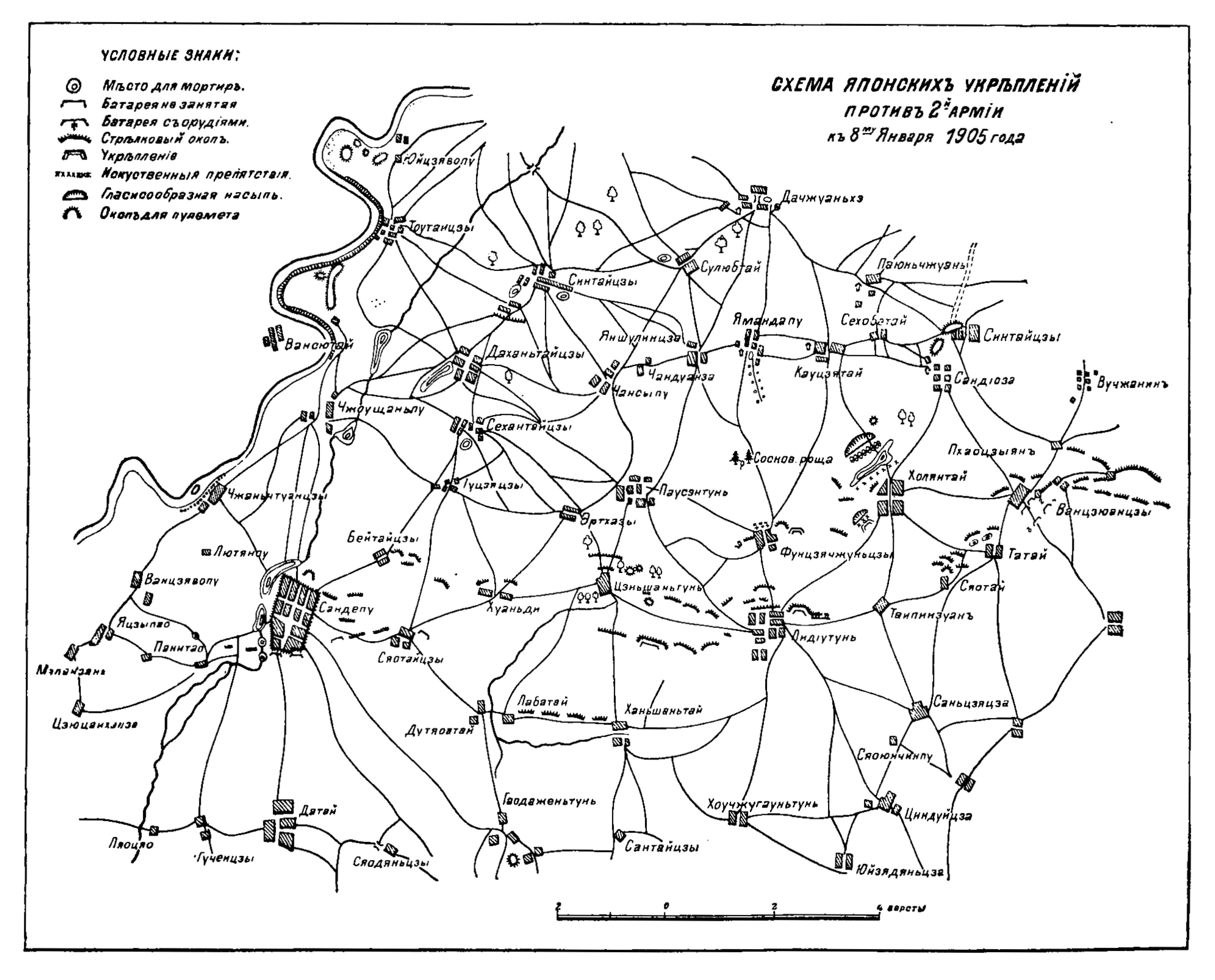 Схема японских укреплений против 2-й армии к 8 января 1905 года