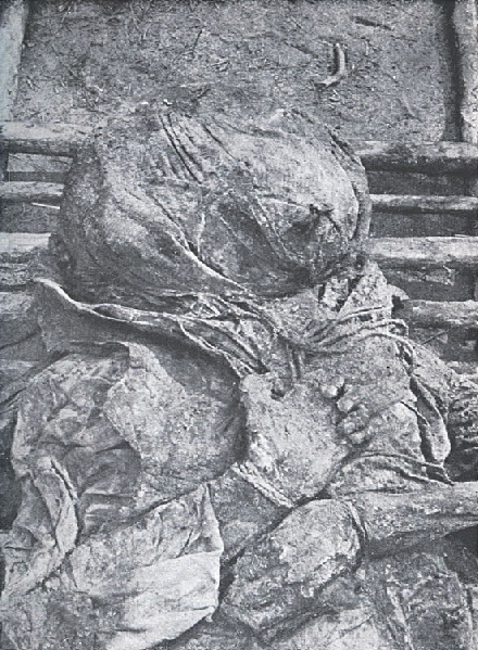 Труп офицера с переброшенной через голову шинелью и связанными за спиной руками. Выстрел сделан в затылок. Воспр. по: Франтишек Гаек. Катынские доказательства.
