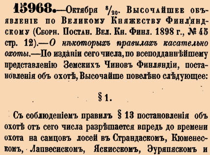 15968. 1898 год. 20 октября (8 октября ст.ст.) Высочайшее объявление по Великому Княжеству Финляндcкому. О некоторых правилах касательно охоты. По издании сего числа, по всеподданнейшему представлению Земских Чинов Финляндии, постановления об охоте, Высочайше повелено следующее: #1. C соблюдением правил #13 постановления об охоте от сего числа разрешается впредь до времени охота на самцов лосей в Страндаском, Кюменеском, Лапвесиском, Яскисском, Эуряпяском и Кексгольмском уездах Выборгской губернии <…><…>