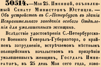 30514. 1856 год. 6 июня (25 мая ст.ст.) Именной, объявленный Сенату Министром Юстиции. Об устройстве в С.-Петербурге в здании Исправительнаго заведения особаго Отделения для умалишенных женщин.Вследствие удостоверения С—Петербургскаго Военнаго Генерал-Губернатора, о крайнем затруднении, встречаемом местным полицейским начальством в призрении умалишенных женщин, Государь Император, в 25 день Мая сего года, изволил Высочайше утвердить предположение Попечительнаго Совета заведений общественнаго призрения в С.-Петербурге <...>