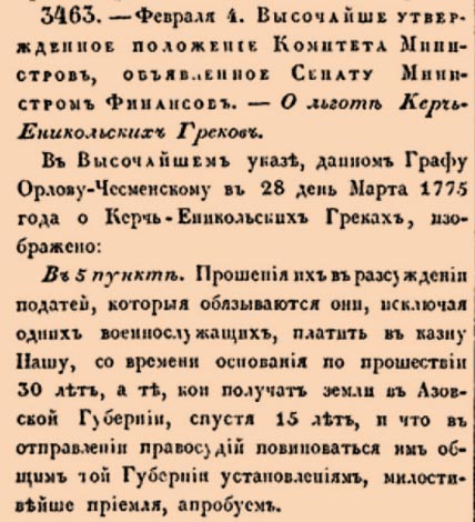 3463. 1830 год. 16 февраля (4 февраля ст.ст.) Высочайше утвержденное положение Комитета Министров, объявленное Сенату Министром Финансов. О льготе Керчь-Еникольских Греков.В Высочайшем указе, данном Графу Орлову-Чесменскому в 28 день Марта 1775 года о Керчь-Еникольских Греках, изображено: В 5 пункт. Прошения их в разсуждении податей, которыя обязываются они, исключая одних военнослужащих, платить в казну Нашу, со времени основания по прошествии 30 лет, а те, кои получат земли в Азовской Губернии <…>