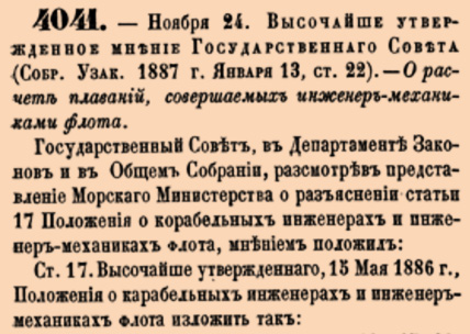 4041. 1886 год. 24 ноября (6 декабря). Высочайше утвержденное мнение Государственнаго Совета. О расчете плаваний, совершаемых инженер-механиками флота. О расчете плаваний, совершаемых инженер-механиками флота.