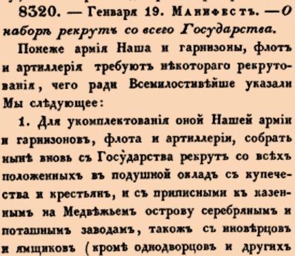 8320. 1741 год. 30 января (19 января ст.ст.) Манифест. О наборе рекрут со всего Государства.1. Для укомплектования оной Нашей армии и гарнизонов, флота и артиллерии, собрать ныне вновь с Государства рекрут со всех положенных в подушной оклад с купечества и крестьян, и с приписанными к казенным на Медвежьем острову серебряным и поташным заводам, також с иноверцов и ямщиков <…>