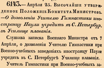 6143. 1833 год. 25 апреля (7 мая). Высочайше утвержденное Положение Комитета Министров. О дозволении Учителю Гимнастики иностранцу Паули учредить в С.Петербурге Училище плавания.