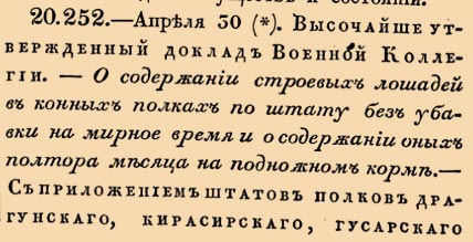 20252. 1802 год. 30 апреля (12 мая). Высочайше утвержденный доклад Военной Коллегии. О содержании строевых лошадей в конных полках по штату без убавки на мирное время и о содержании оных полтора месяца на подножном корме.