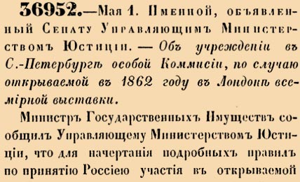 36952. 1861 год. 1 мая (13 мая). Именной, объявленный Сенату Управляющим Министерством Юстиции. Об учреждении в С.-Петербурге особой Коммисии, по случаю открываемой в 1862 году в Лондоне всемирной выставки.