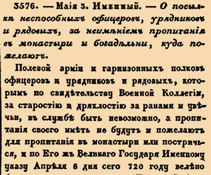 3576. 1720 год. 14 мая (3 мая ст.ст.) Именный. О посылке неспособных офицеров, урядников и рядовых, за неимением пропитания в монастыри и богадельни, куда пожелают. Полевой армии и гарнизонных полков офицеров и урядников и рядовых, которые по свидетельству Военной Коллегии, за старостию и дряхлостию за и увечьи, в службе быть невозможно <...>