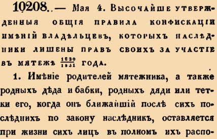 10208. 1837 год. 16 мая (4 мая ст.ст.). Высочайше утвержденныя общия правила конфискации имений владельцев, которых наследники лишены прав своих за участие в мятеже 1830/1831 года Имение родителей мятежника, а также родных деда и бабки, родных дяди и тетки его, когда он ближайший после сих последних по закону наследников, оставляется при жизни сих лиц в полном их распоряжении и от запрещения освобождается.